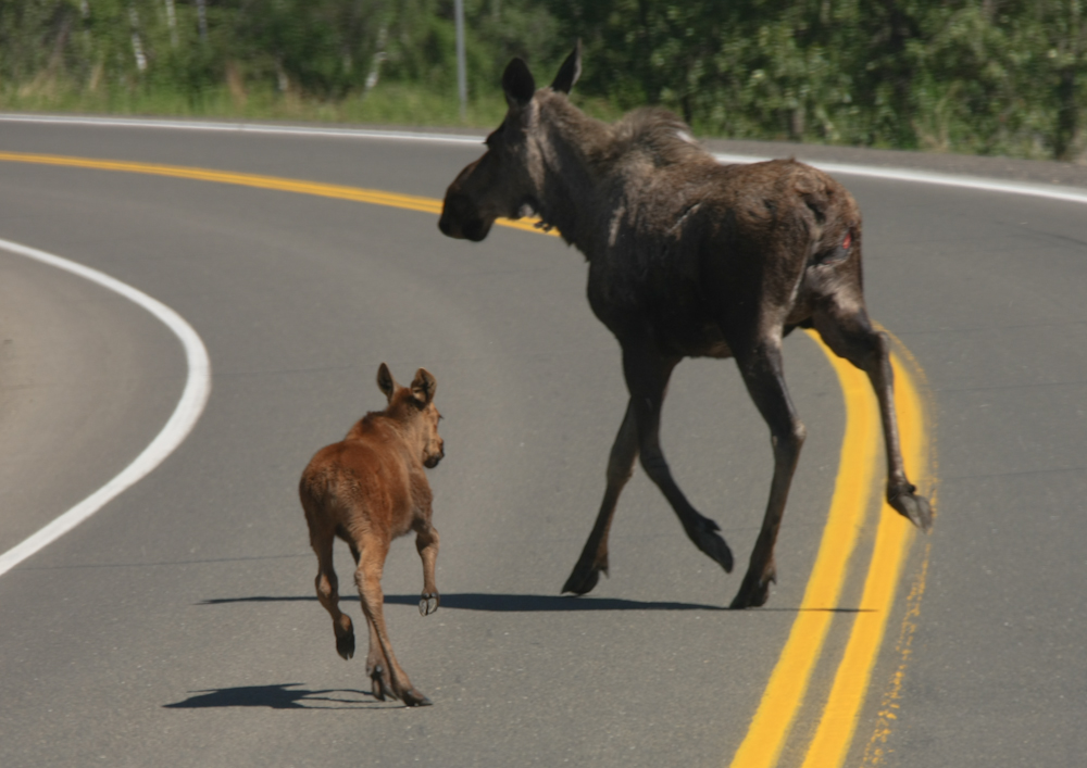 Next morning, we packed and headed north toward Coldfoot, Alaska. Within 60 miles of Fairbanks, we came across this moose cow and calf crossing the highway.