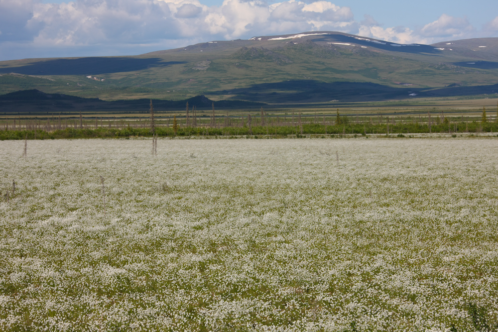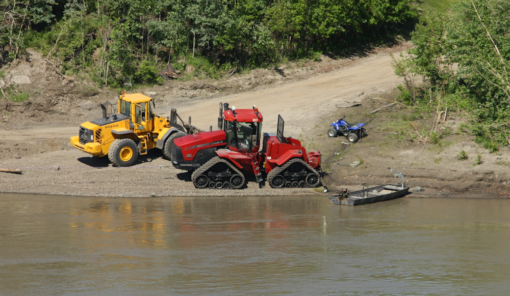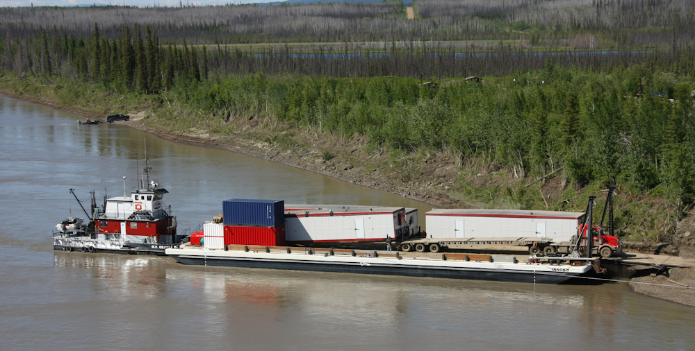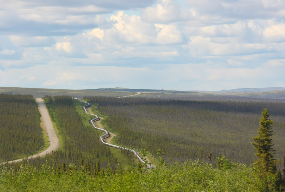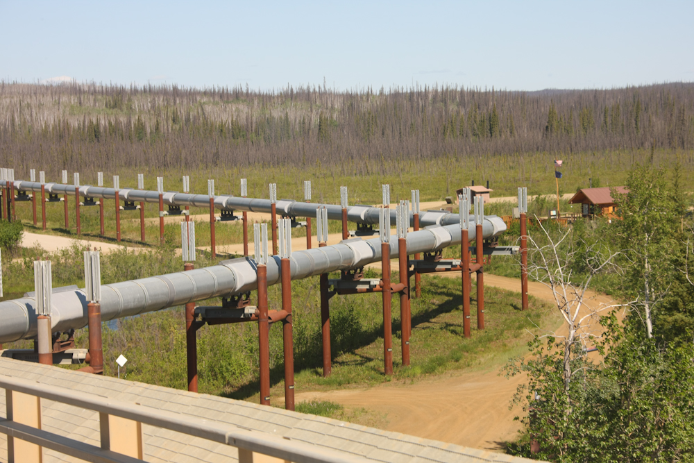 On the north bank of the Yukon River, the Trans-Alaska Pipeline (TAP) is clearly visible and elevated to prevent damage to the permafrost. The silver gadgets at the top of the support posts are passive radiators that dissipate heat that is conducted from pipe to the posts.