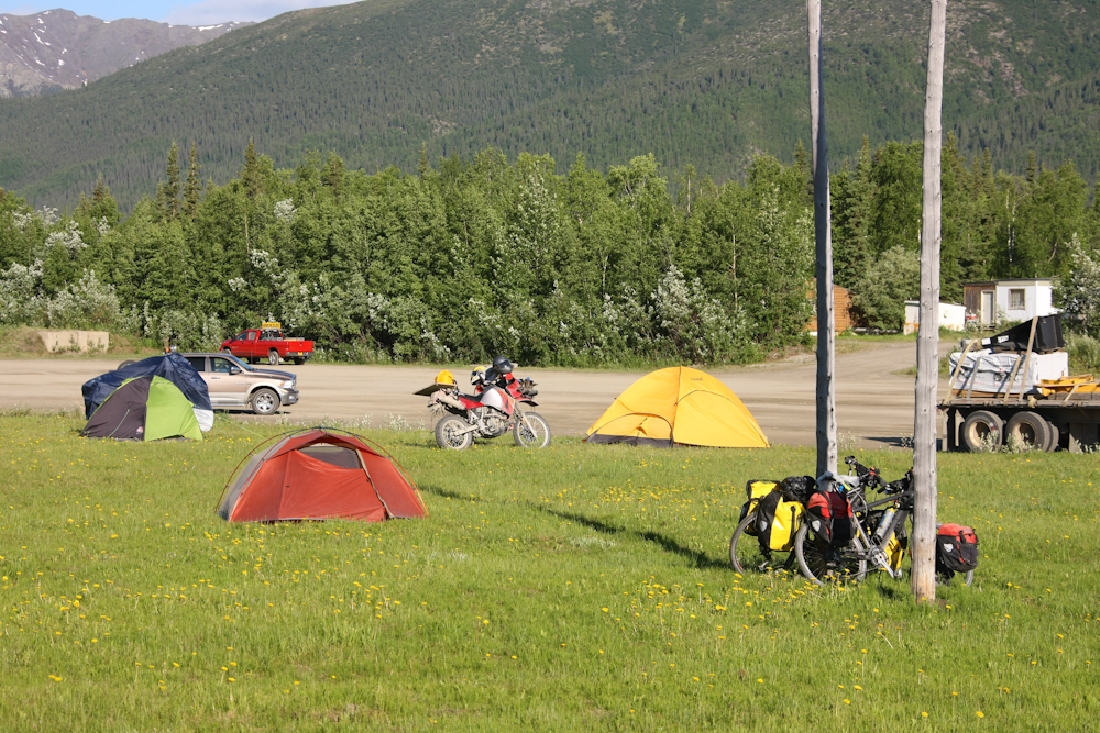 We passed a number of motorcyclists that were making the run to Deadhorse (Prudhoe Bay). There were also some hearty bicyclists that were abusing themselves on the same road. Coldfoot lets campers pitch tents nearly anywhere as long as they are not in the way of the trucks ingress and egress.