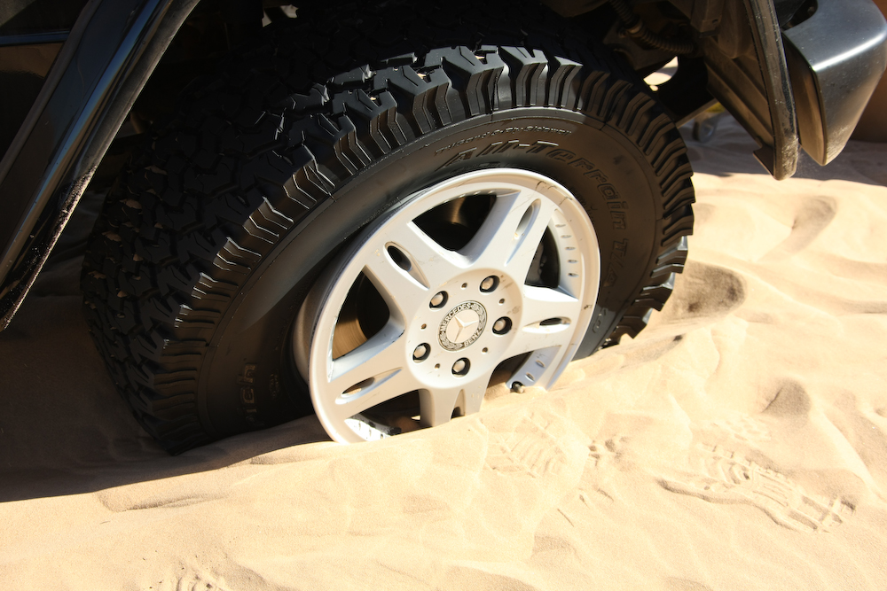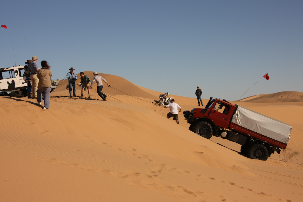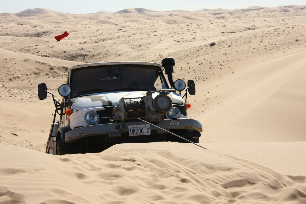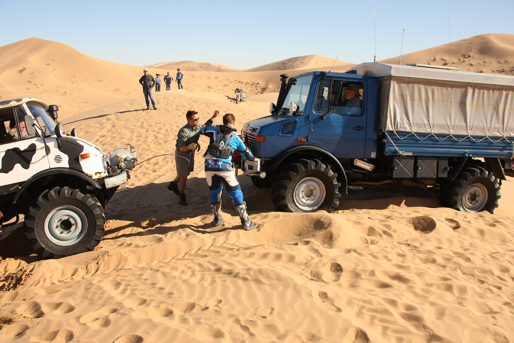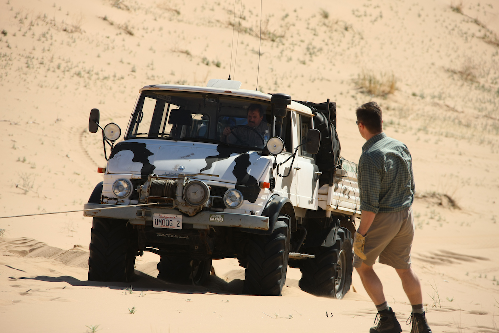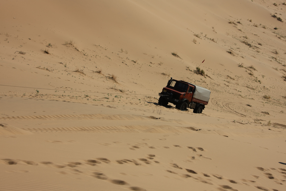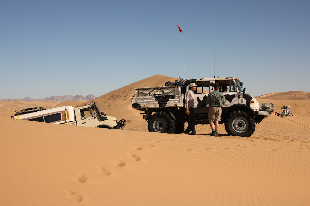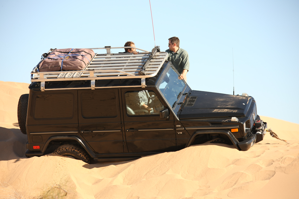 The G-wagon gets into trouble and we set up for a tow. Note the depth of the sand around the wheels.