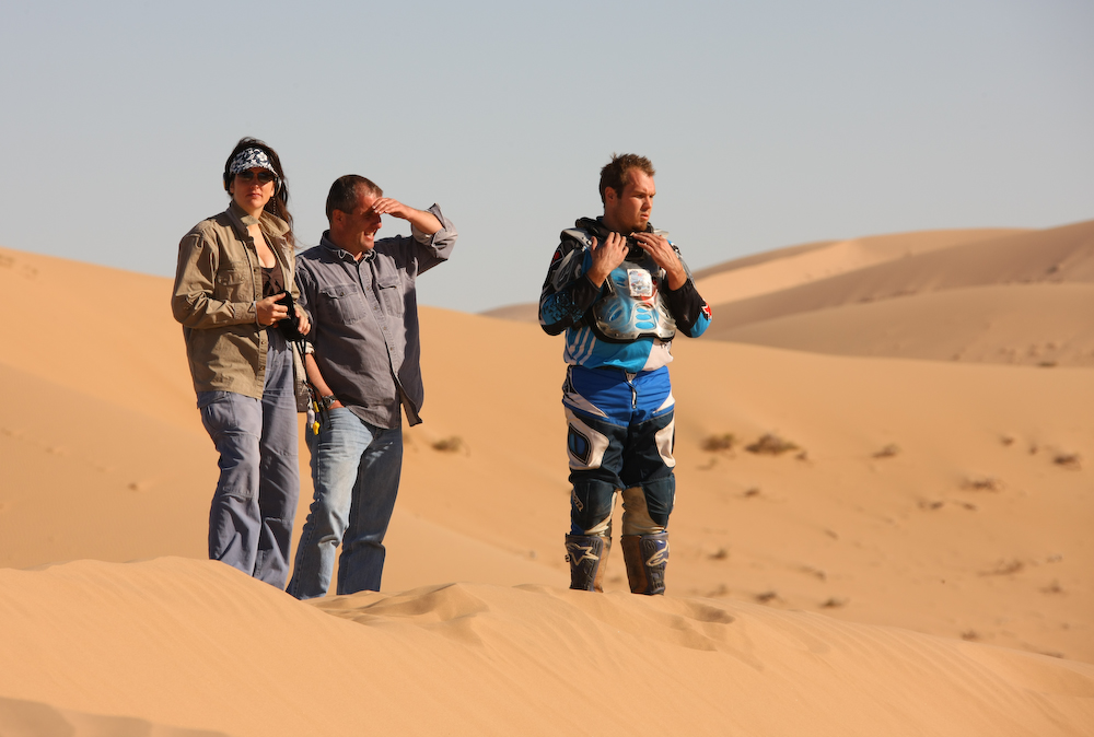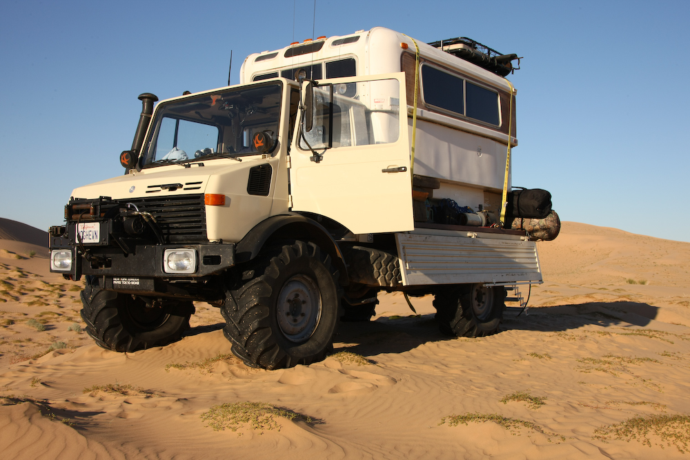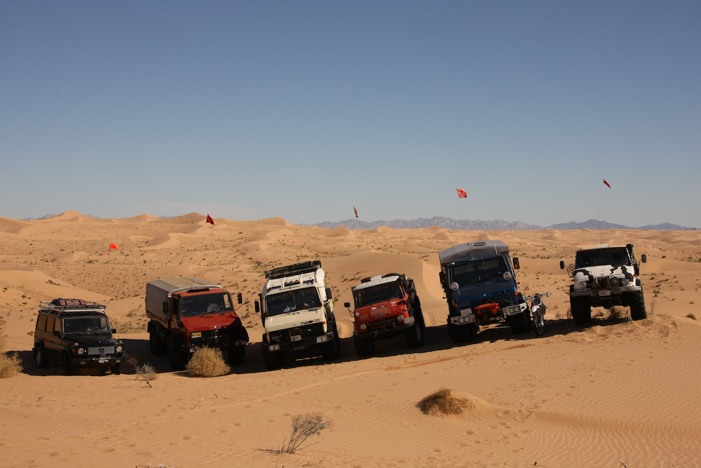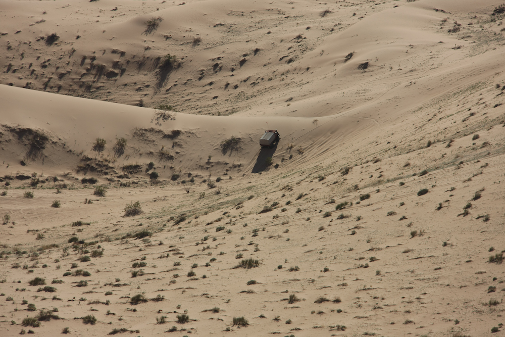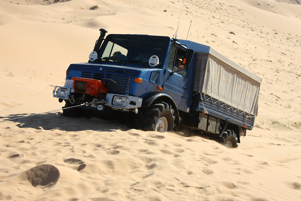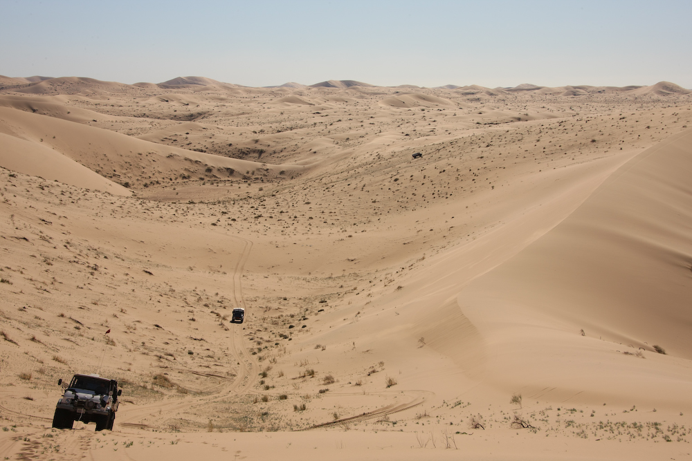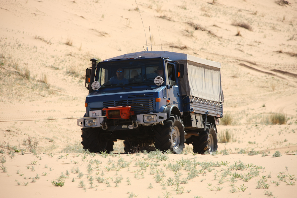 The G-wagon gets into trouble and we set up for a tow. Note the depth of the sand around the wheels.