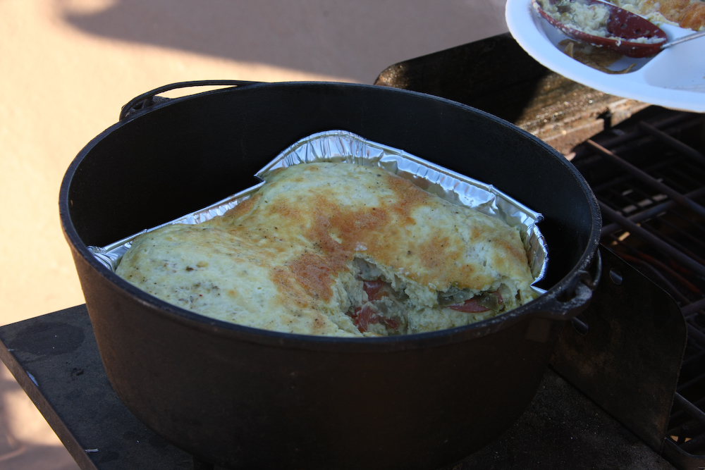 For breakfast, Kathleen prepared a chili relleno casserole. She made 2 big 14" dutch oven's worth and we ate it all.