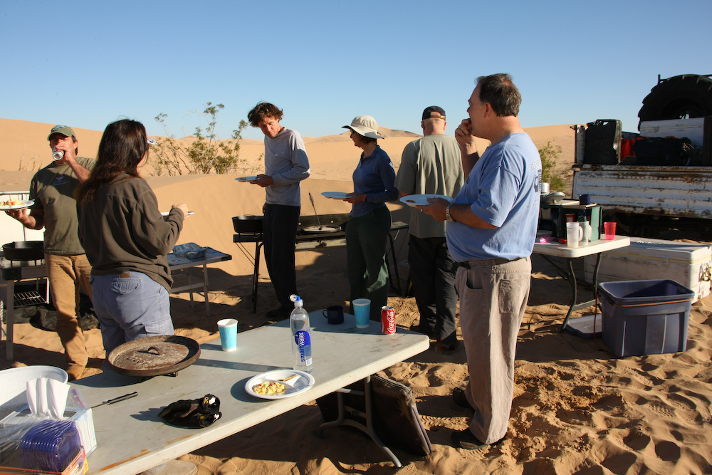 As the night progressed, the winds grew progressively stronger. We decided that some form of protection from the blowing sand would be appropriate, so we rigged a wind block with the tables. This seemed like a good idea, but there were still passages for the wind. These passages created a venturi that sprayed sand over our bed and our faces all night.
