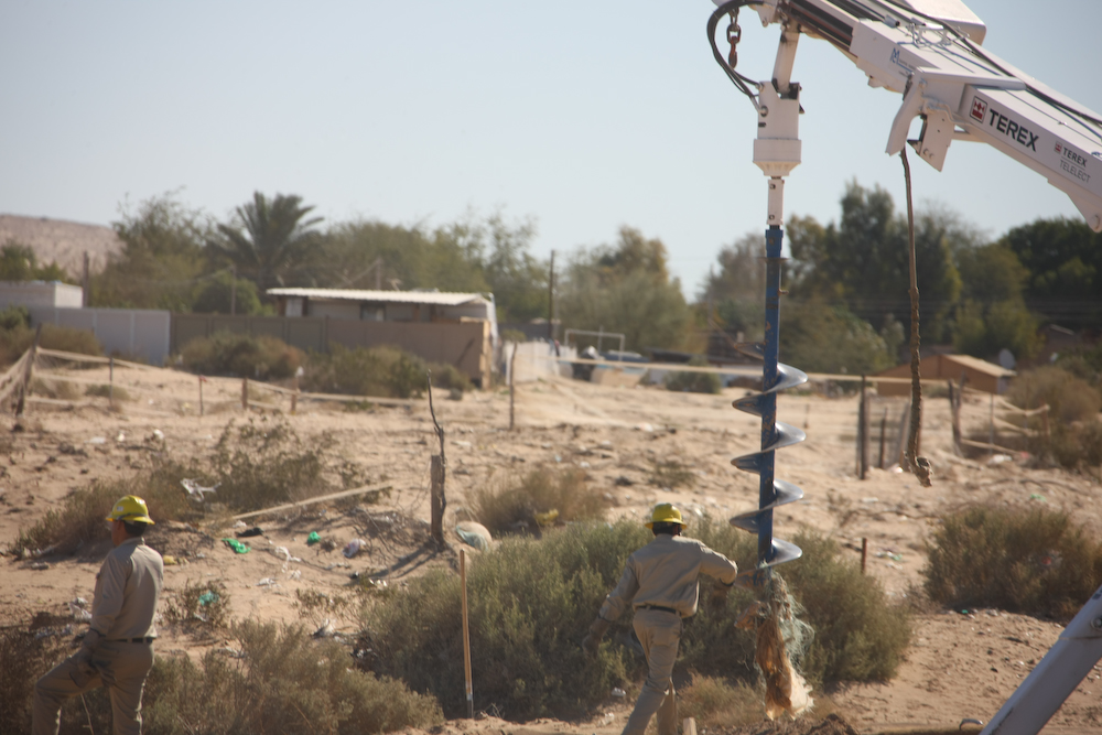 On the outskirts of El Golfo we encountered a CFE crew planting power poles. Above, the crew discovers that the area they are drilling in was an old land fill area. The auger is fouled with old fishing nets.