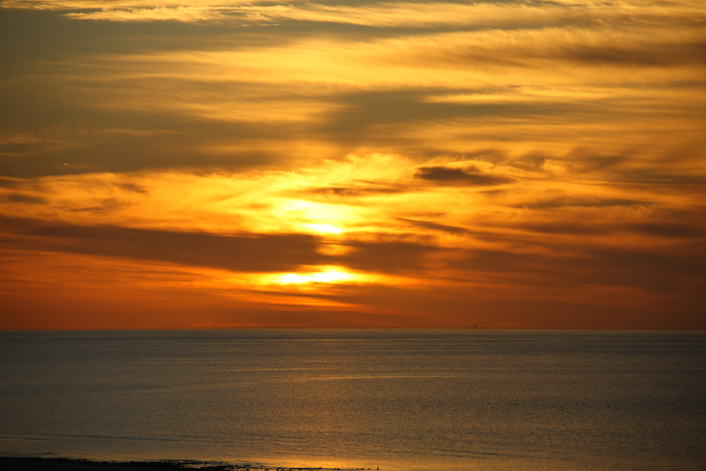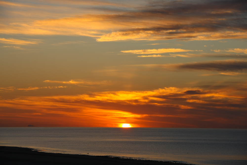 Scattered clouds on the eastern horizon provided a nice sunrise photo. Note the island on the left end of the photo.