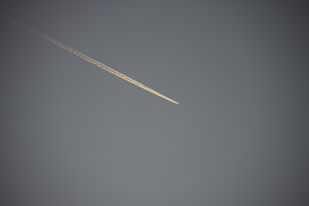 The waning sunlight illuminated a vapor trail from a passing jet.