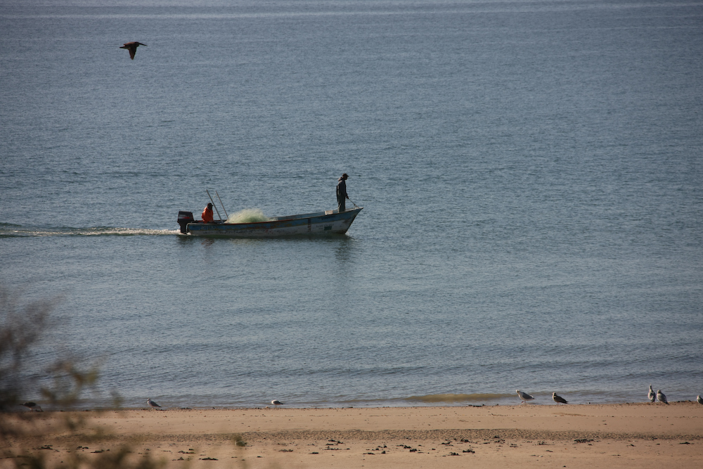 Local fishermen in their panga looking for bait fish.