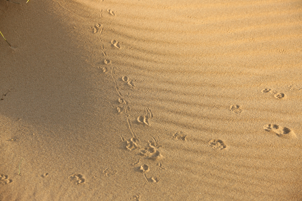 This patch of sand show tracks of several kinds of critters. Note the set going left to right appear to be left by something with pads and claws. The bottom to top track shows tail-drag marks as well as scrapes from claws.