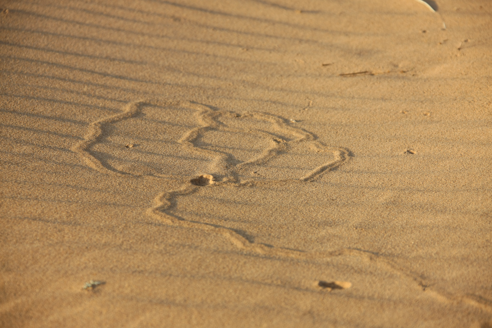This set of marks is due to something burrowing under the surface of the sand. The entrance point is visible as the hole near the center of the photo. Whatever left these tracks, it looked a bit lost.