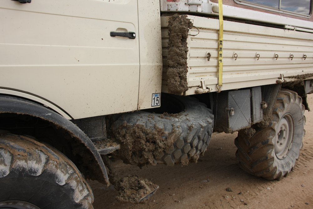 A high speed run across the now wet Laguna Salada left huge clumps of mud on the truck. Note the heap on the lower step about 8" thick. This is slick, clay-based mud that really sticks to everything.
