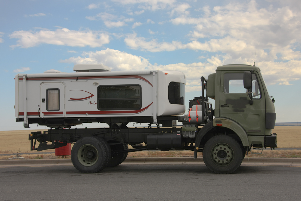 Note the propane bottles strapped down on the tire rack.  At the last minute, since we could not complete the propane mount, I elected to take the bottles with us for completion of the task in San Diego.  Note all the light under the body of the camper.  This space will be filled with tool boxes once the construction is complete.