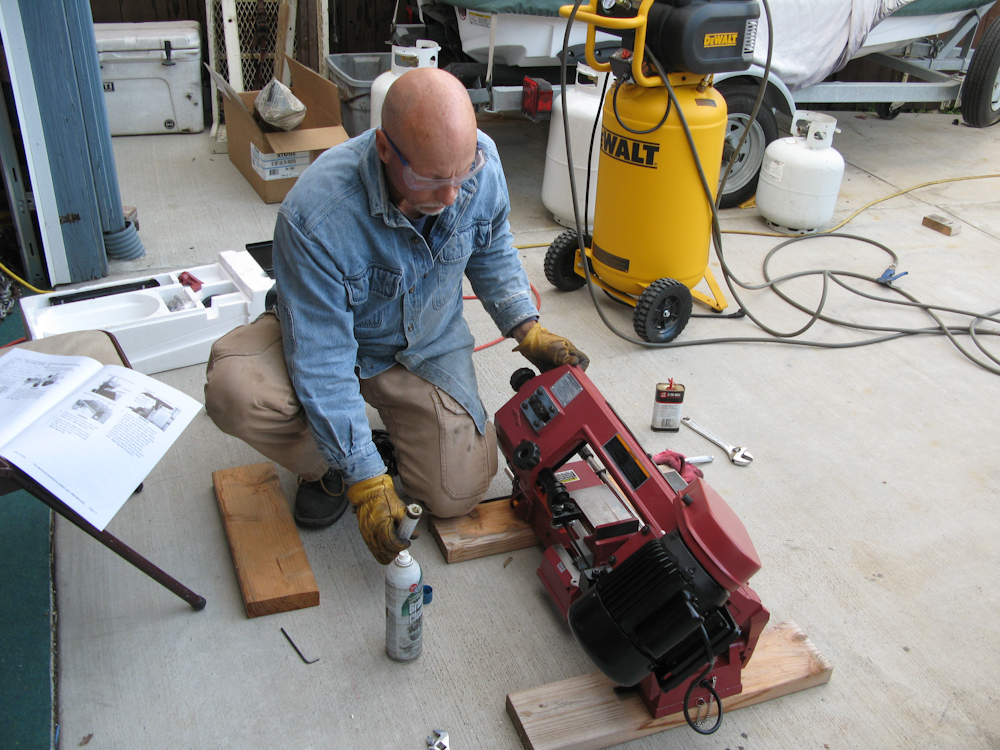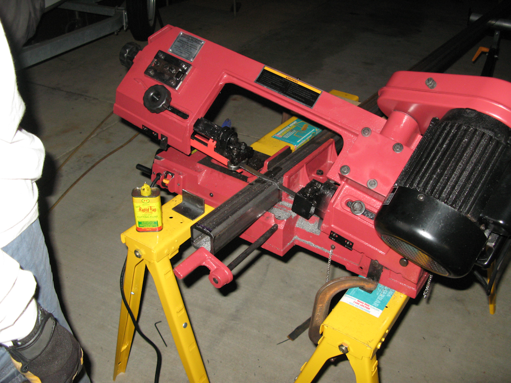 While we had completed construction of part of the propane bottle tray, the mounting frame still needed to be fabricated.  After seeing the horrible mess that a cutoff saw made in my driveway (dust, debris and noise) I elected to purchase a band saw.  After reviewing what was available in a reasonable time, I elected to visit Harbor Freight in a nearby city.  I was not impressed with the quality of their offering, but the price was right and I was reasonably sure that their saw would do most of what I needed.  Plus, it was available now as opposed to a 2 week delivery cycle with shipping fees.  So, I bought the saw, loaded it into my car and returned home to start work on the mounting frame.