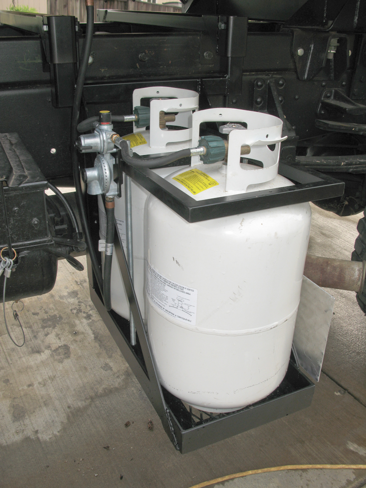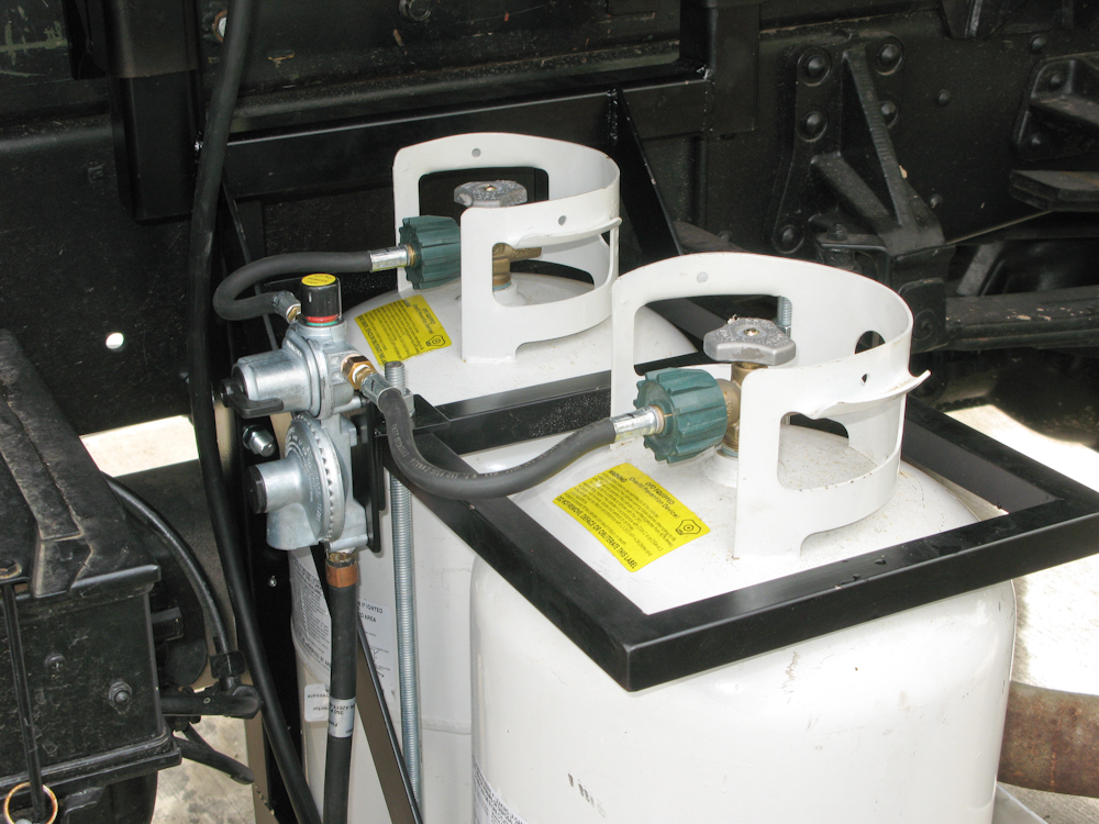 A mounting plate for the propane regulator was fabricated, painted and installed.