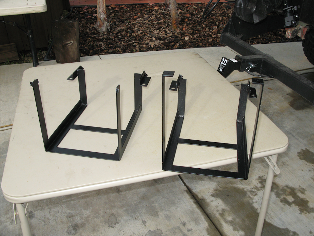 The top frame members were reinforced with 1/4" gussets and mounting tabs were added.  When the welding was completed, Kathleen took them to the "paint shop" in  the back yard.