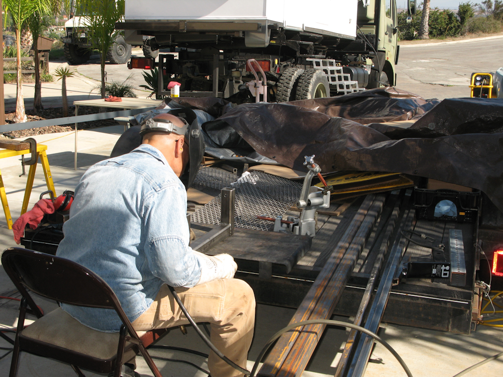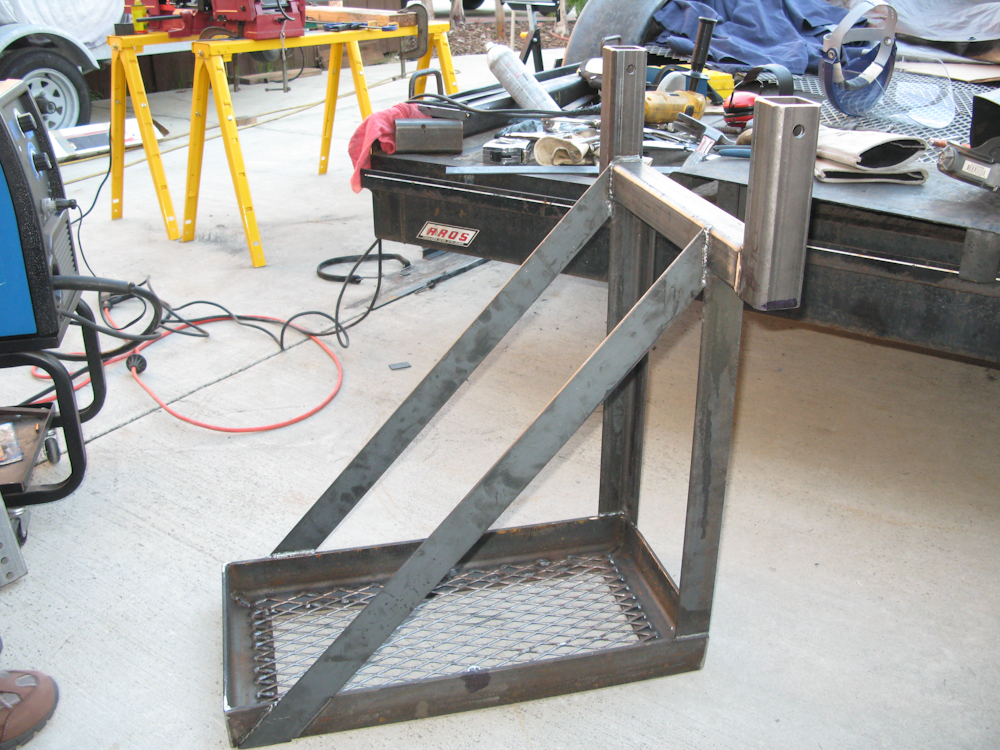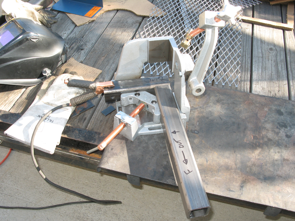 Once the descenders were verified to fit as expected, they were "sewn-up" and hard-welded together.  I have been using my trailer as my work bench as there is no space in my garage.  The trailer is a reasonable substitute for a regular shop unless the weather turns against you, which it did.