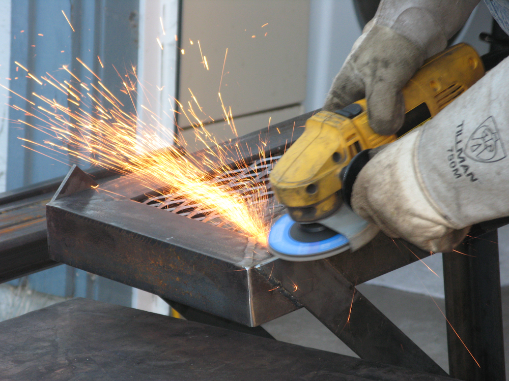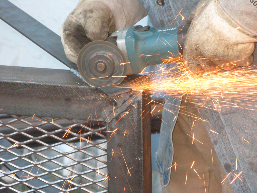 The descender assembly was welded to the bottom tray and support straps were added.  Above, a support strap is cut after welding.