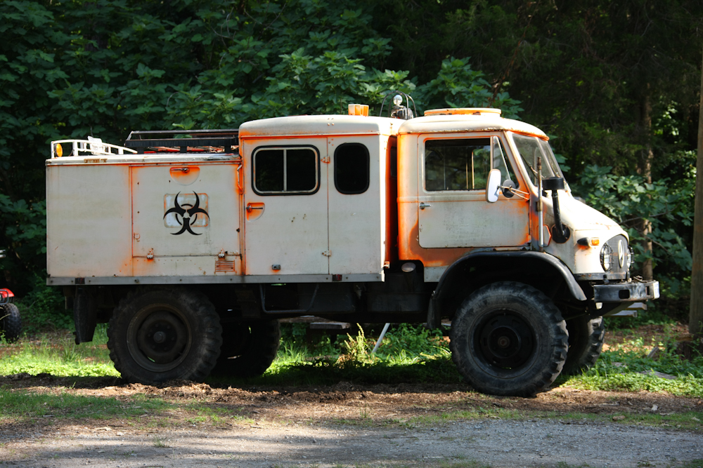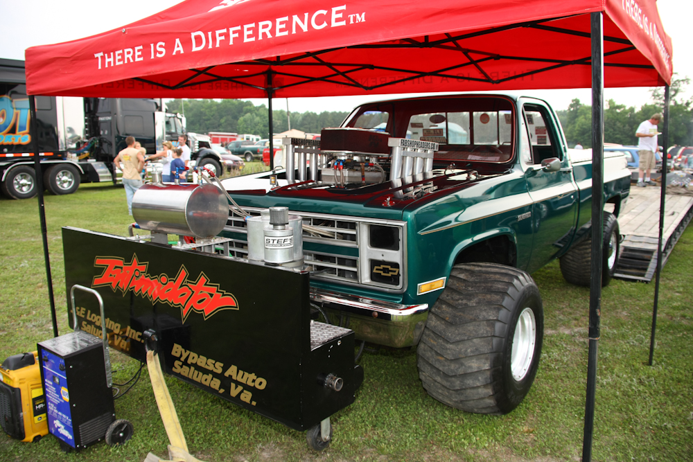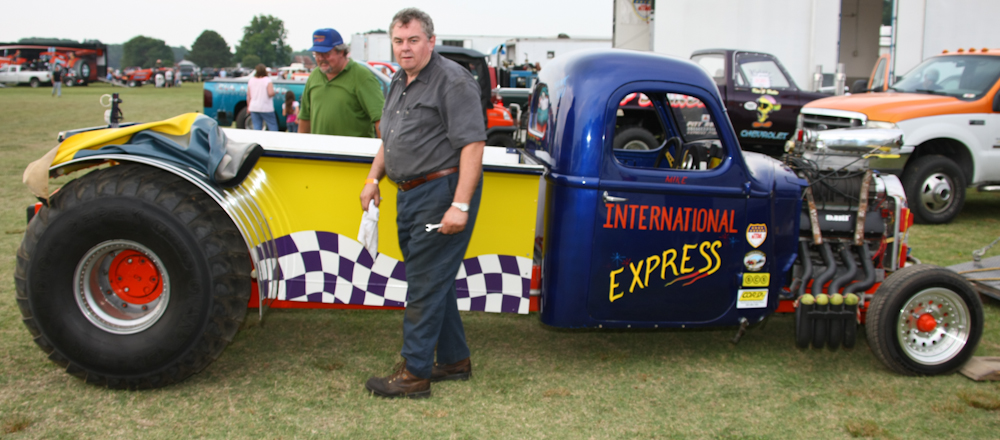 rig has an old International Harvester cab behind a big, blown V8 motor.