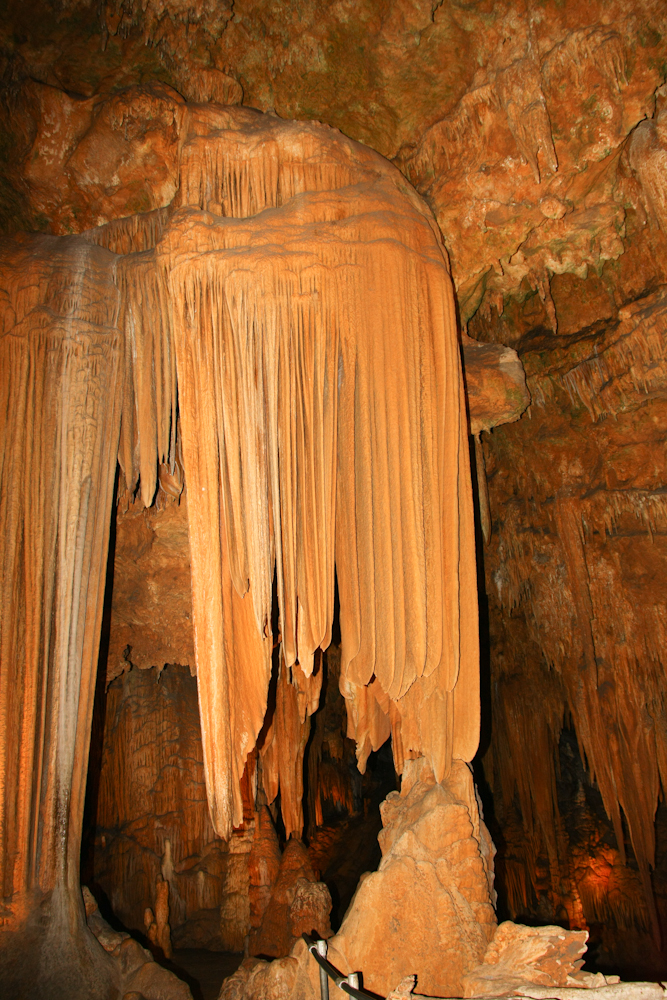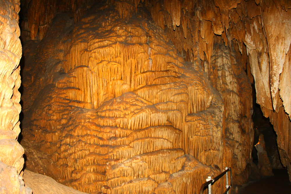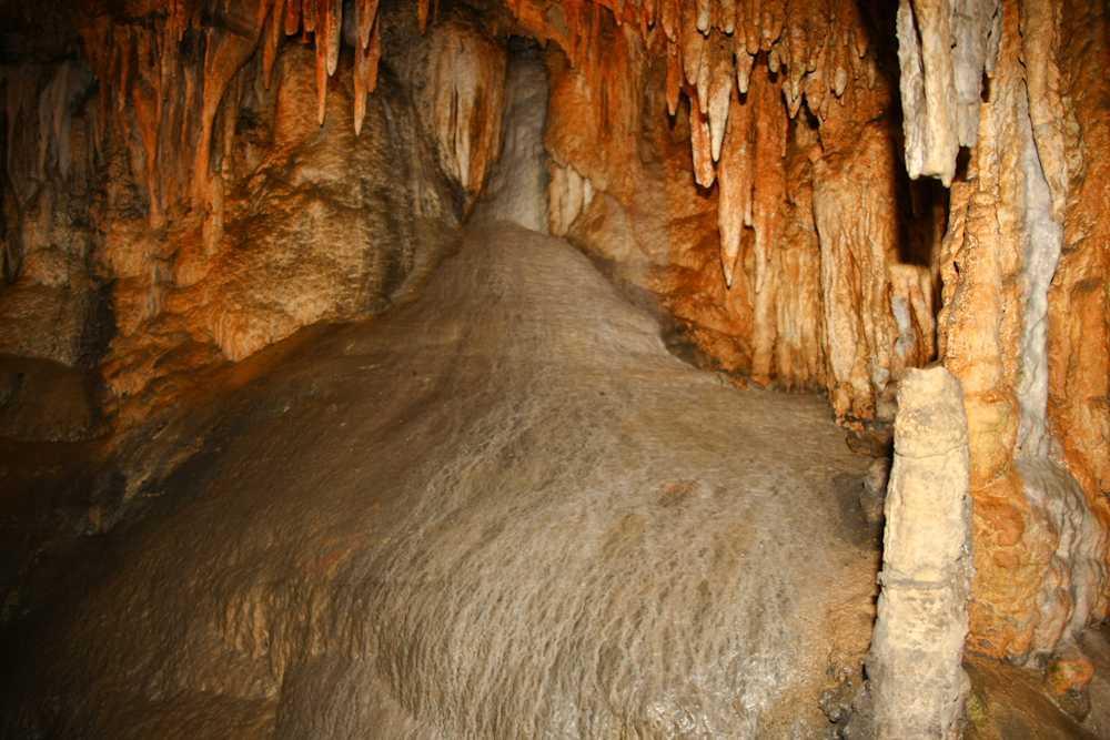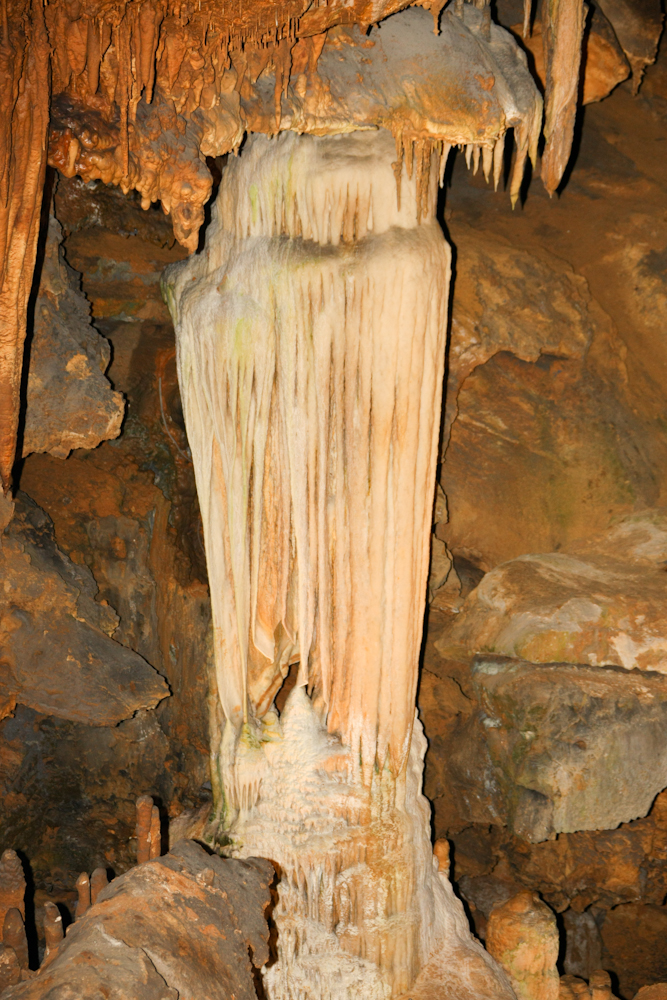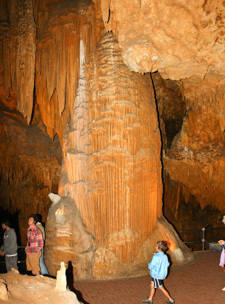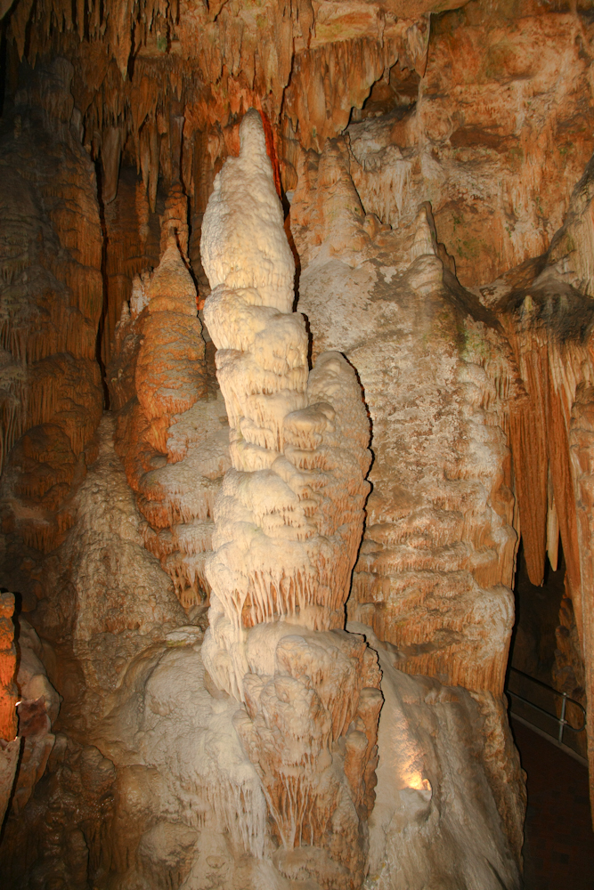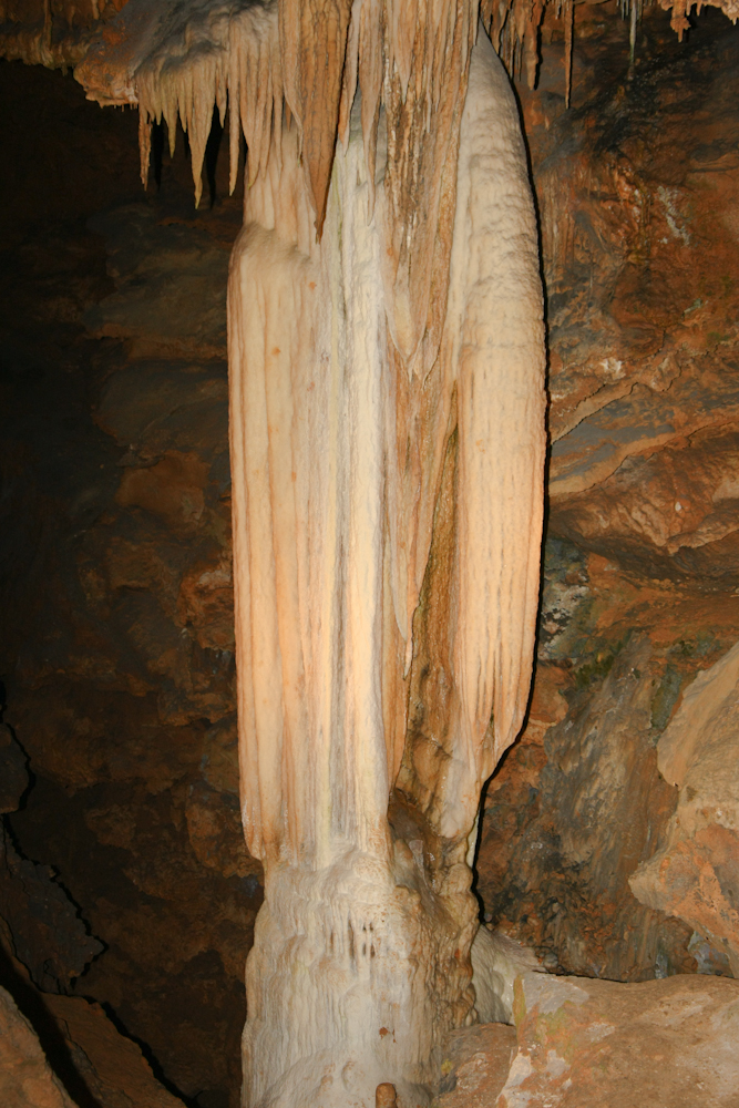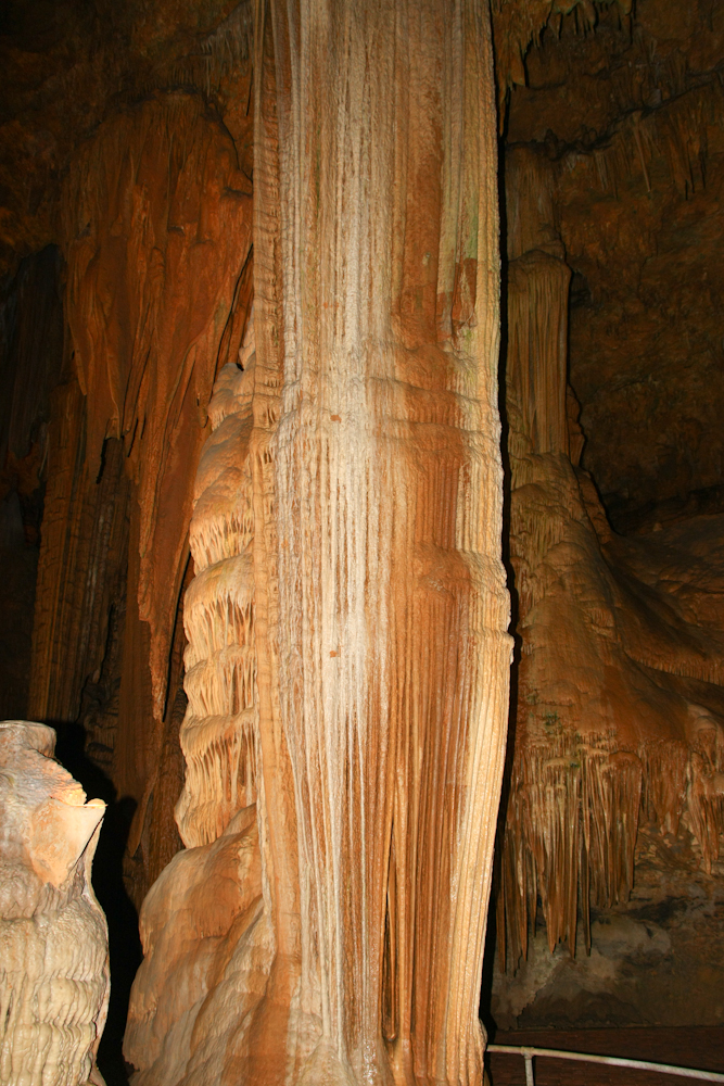 One of the biggest columns in the cave. In reality, it is a stalactite that has fused with a stalagmite. Note that at the left of the column it is fluted and has material deposition has occurred from the bottom up. On the right, the deposition has occurred from the top down, thus the differing shapes and textures.