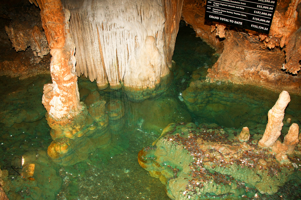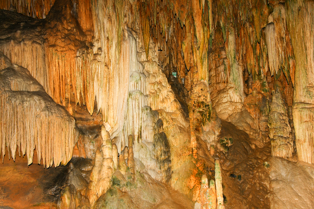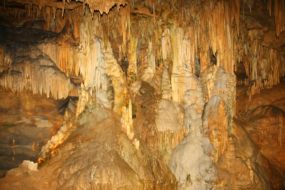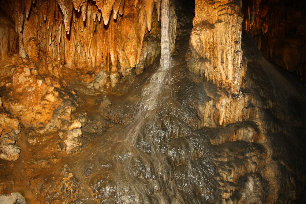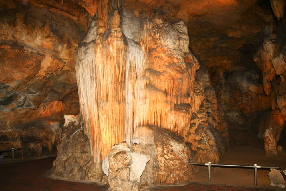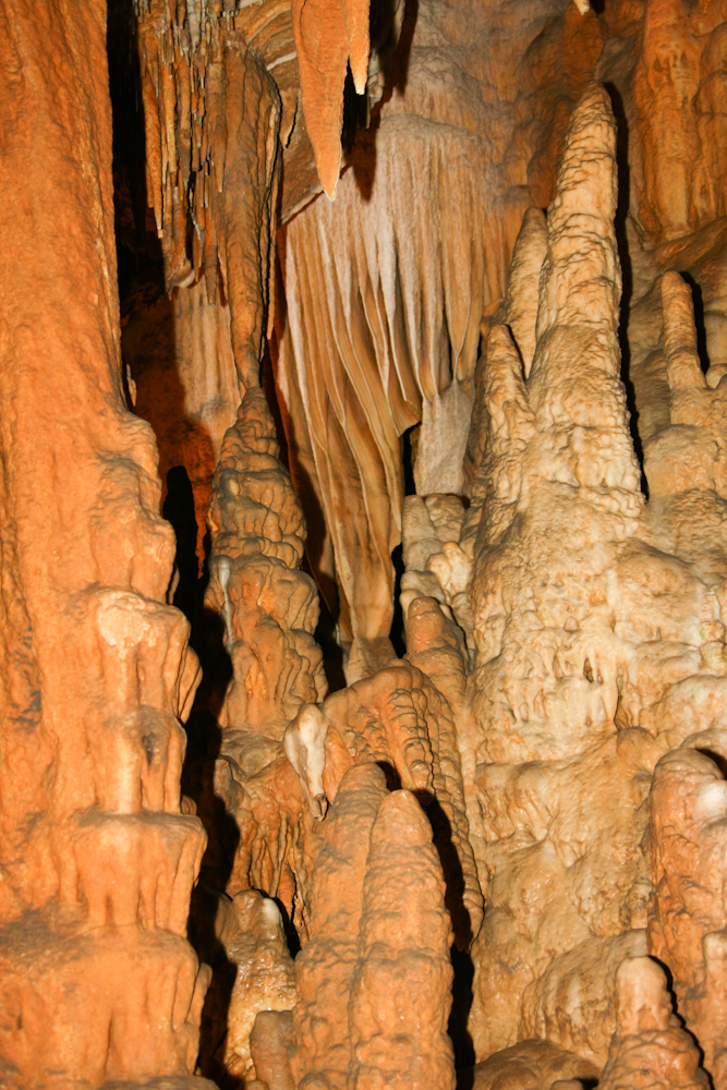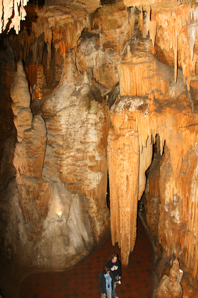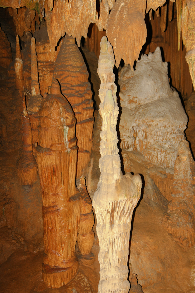 One of the biggest columns in the cave. In reality, it is a stalactite that has fused with a stalagmite. Note that at the left of the column it is fluted and has material deposition has occurred from the bottom up. On the right, the deposition has occurred from the top down, thus the differing shapes and textures.
