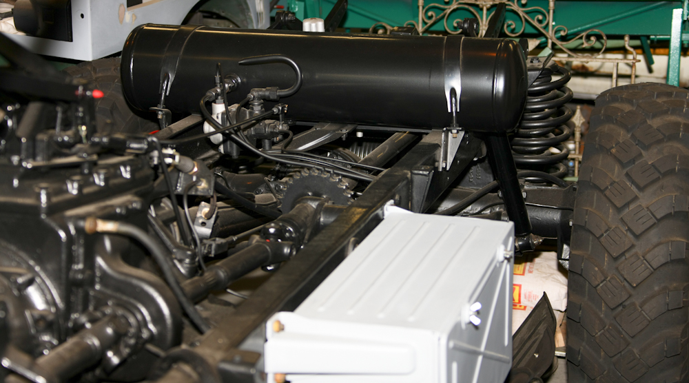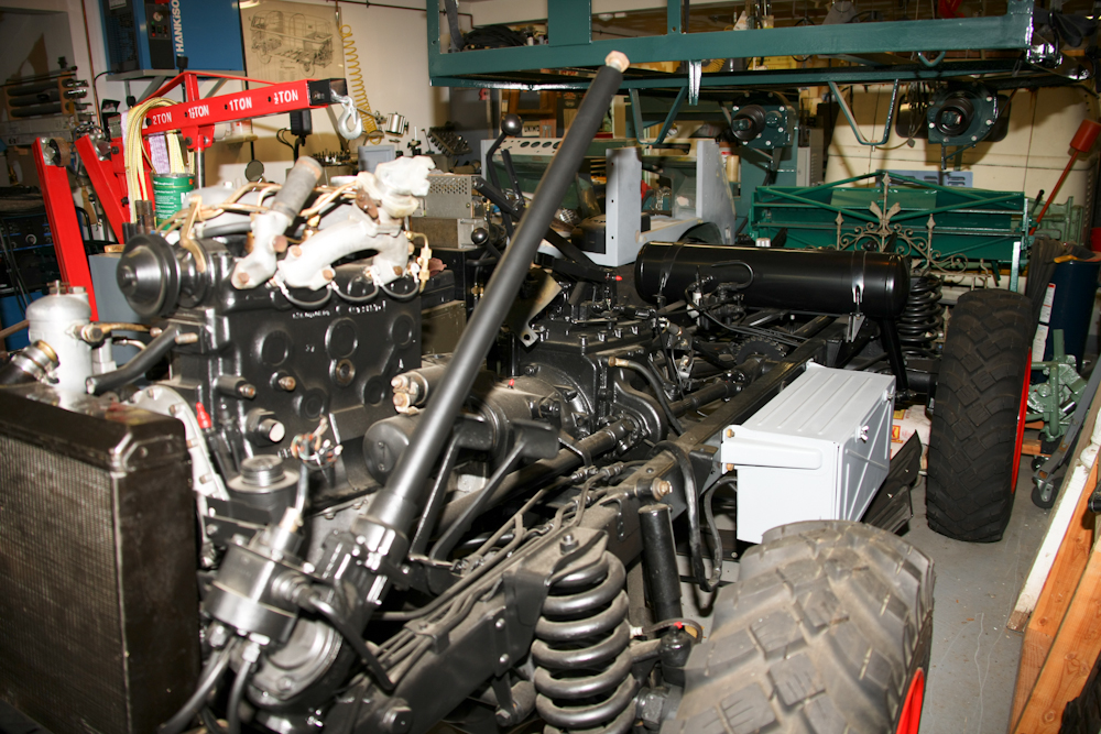 The air tank is at the rear-center of the photo above. Also visible are the PTO shaft and the chain drive. The chain drive was used to power an outboard generator mounted in the bed of the truck.
