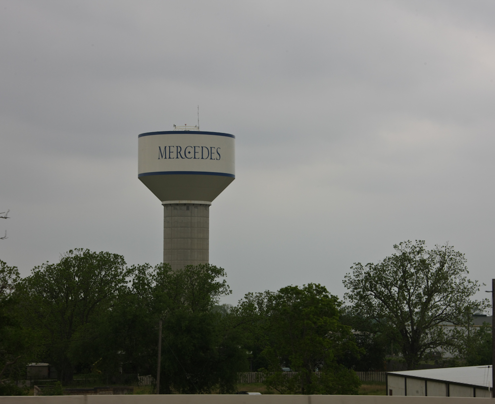 From South Padre, we headed inland toward Laredo to see a friend of Kathleen's who lives there. Along the way, we passed through Mercedes. And you thought it was only a car brand!