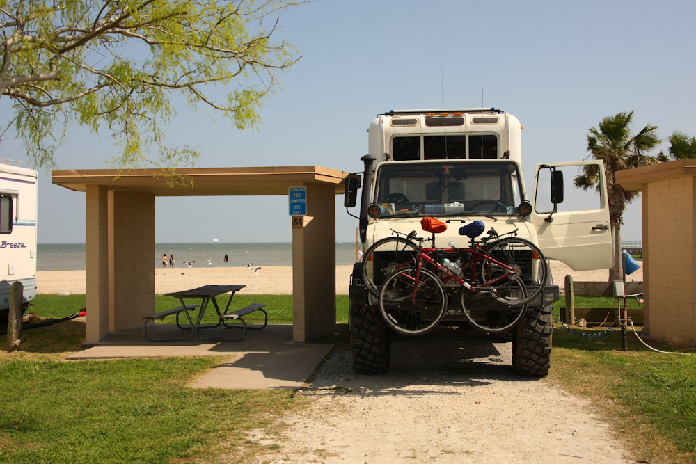 When we hit the south end of the island again, we decided to stop early for the day. We stayed at a nice KOA there and did laundry and chores. From our camp, we had a commanding view of the long causeway that connects South Padre with the mainland.