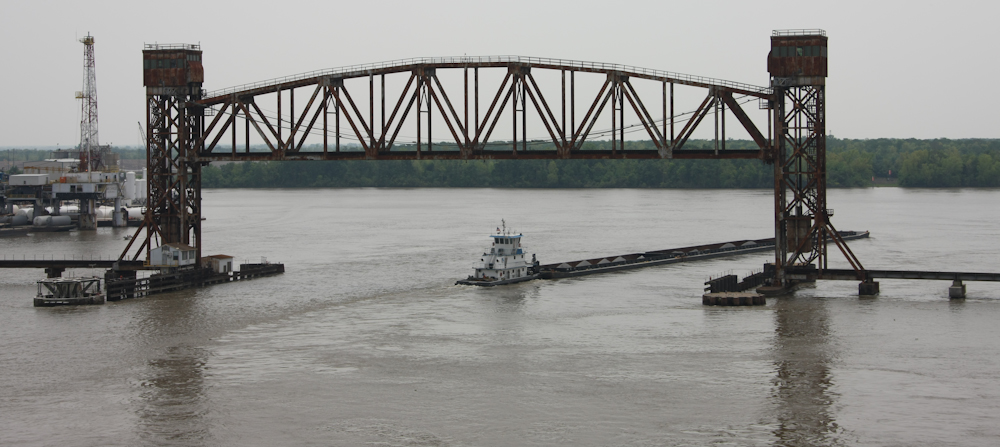 Above is a railroad drawbridge that was lifted to allow the tug and barges to pass.
