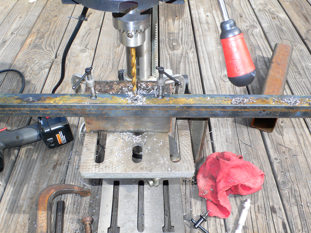 The frame and feet were made from 16 ga square tubing. Above, holes are drilled in the feet to allow connection to the angle iron mounts.