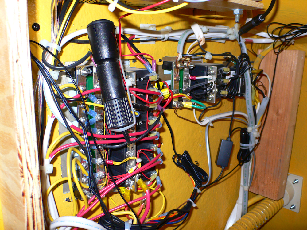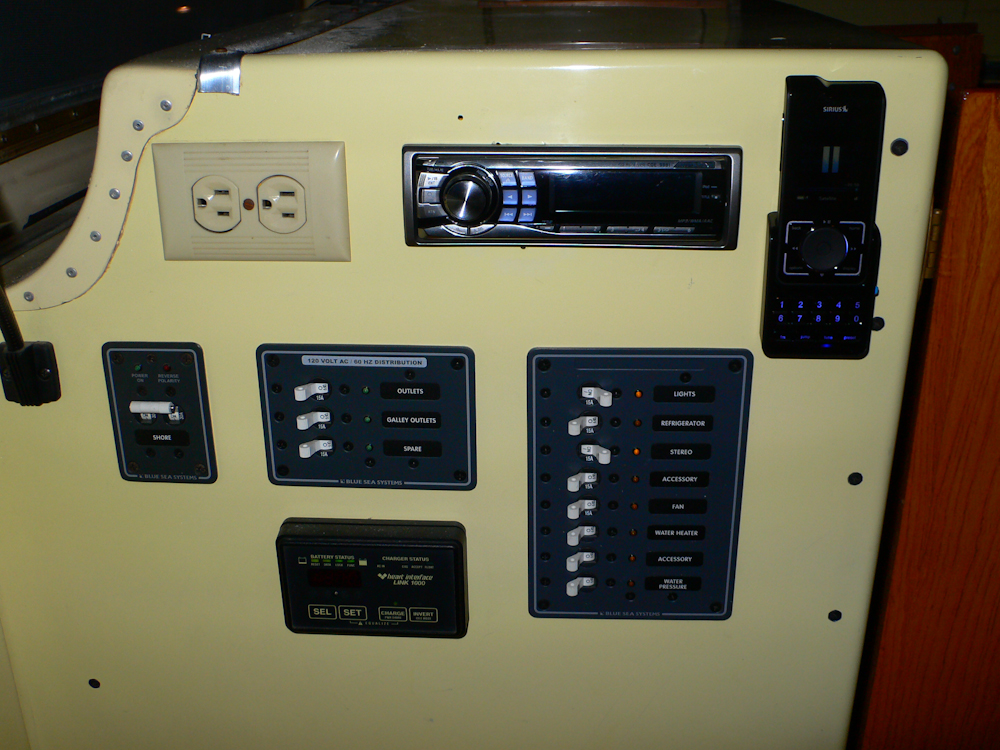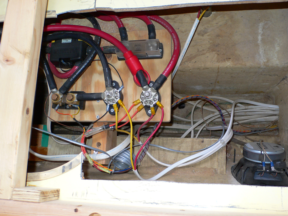 While everything was torn apart, we decided to add an XM satellite radio system as well. Sadly, the XM wiring kit was not RV friendly and all of the clutter is due to that system. I was lucky, however. I was reading a news group about the kit and noted that you MUST use their cigarette lighter setup as part of the wiring. Some other fellow did what I was planning to do (which was remove the connection and solder it together) but burned his unit up, violating the warranty along the way. It turns out that the connector has a voltage converter in it and the radio uses 7 volts, not 12. But, after all the time I put into getting the wiring harness sanitary and neat, it galls me to no end to see their hokey setup. All of the black wires in the photo above are part of the radio. That said, it does work.