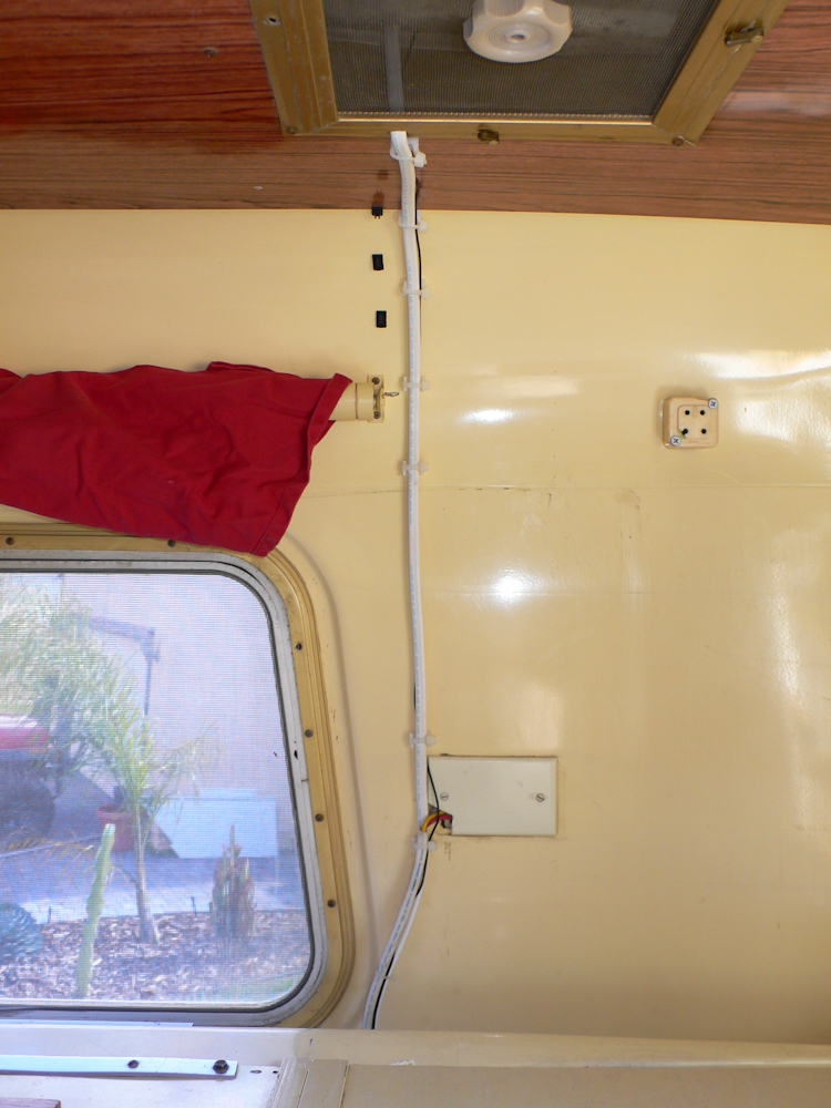 12 AWG marine safety cable and the satellite antenna cable were run to the roof. Recall that the roof of my camper hydraulically elevates, so that makes wiring things to the roof challenging and requires adequate slack in the harness.
