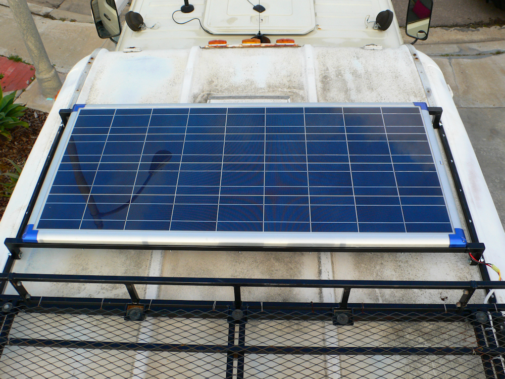 When we completed the tires, we decided to add a 130 watt solar panel. We have discovered that the mog, when operated a low RPM, never generated sufficient current to recharge our 200 amp-hour house battery array. We have a small Honda generator, but that is a hassle as well as noisy. Plus, if you are stationary for several days you MUST run the generator or the batteries will die. Following the lead of our friends Steve and Debra, we added a high power panel. This panel is marine-grade and absent some mechanical trauma, it should last for many years.
