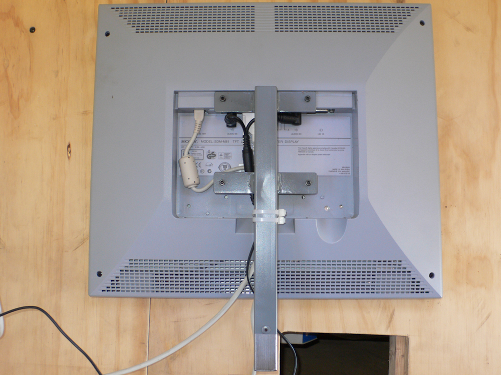 Since idle hands do the devil's work, and we also had a spare computer monitor screen around, I decide to build a mount for it so when we watch DVDs we don't have to watch them on the small laptop screen. Above is the mounting fixture.