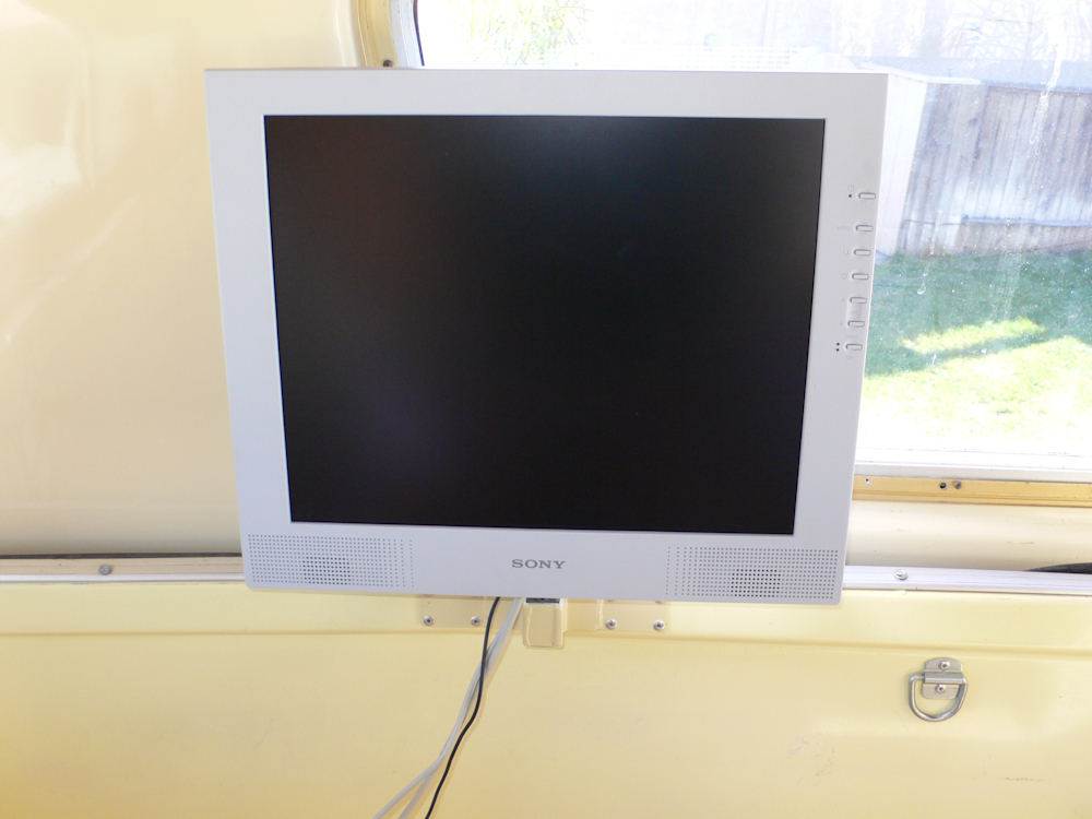 We had a 19" panel left over from a dead system, so I welded up a bracket to fit the back and plug into the mount on the camper wall.