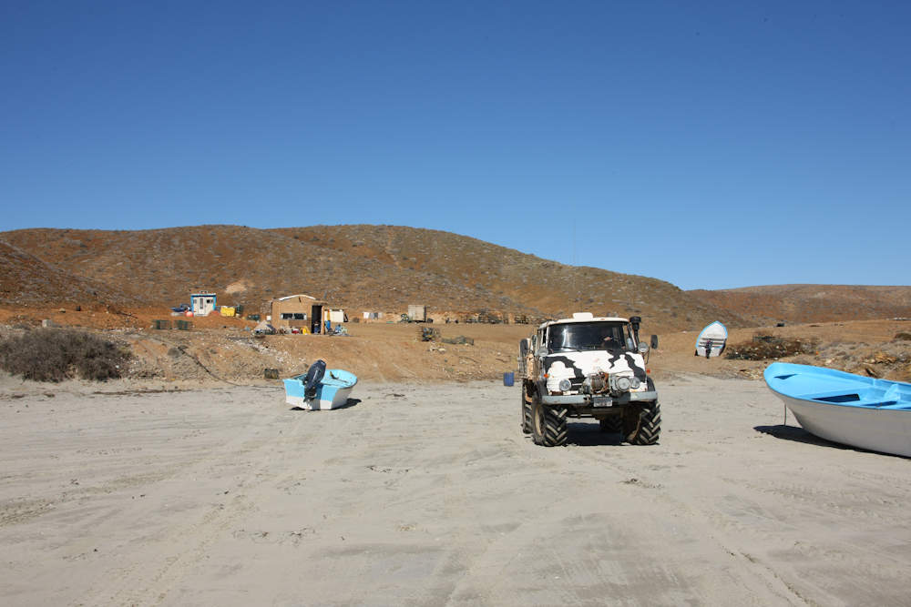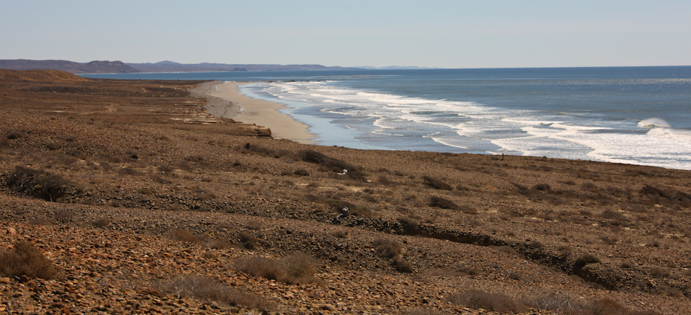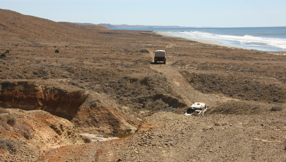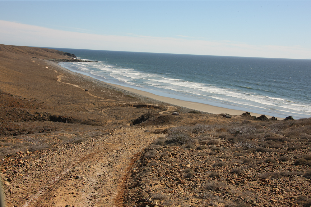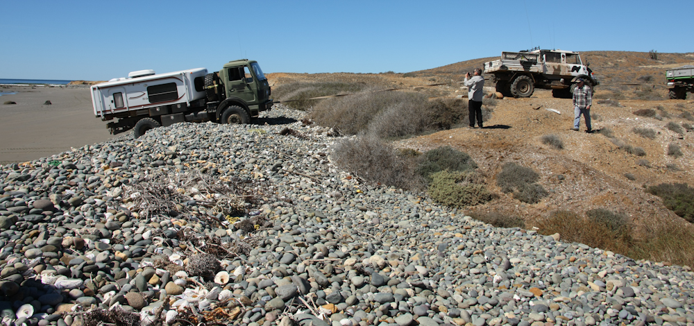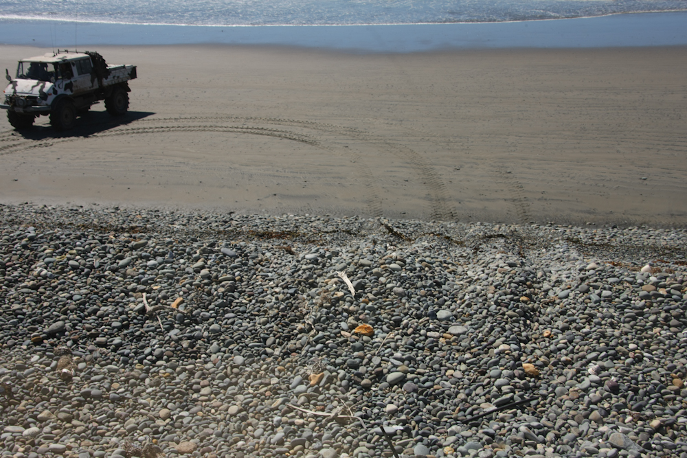 The group attempted a beach run, but was turned back by the gravel berms. Above, they return to the "main" road which is visible along the coast.