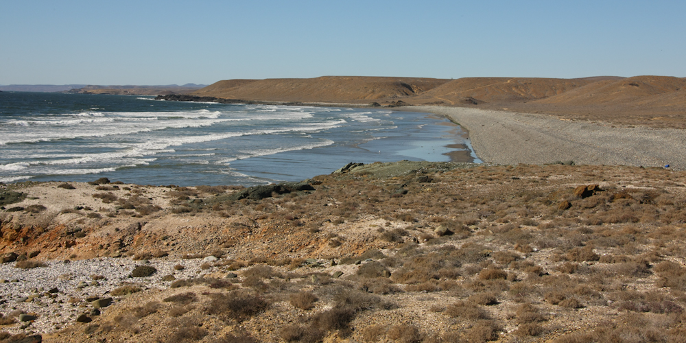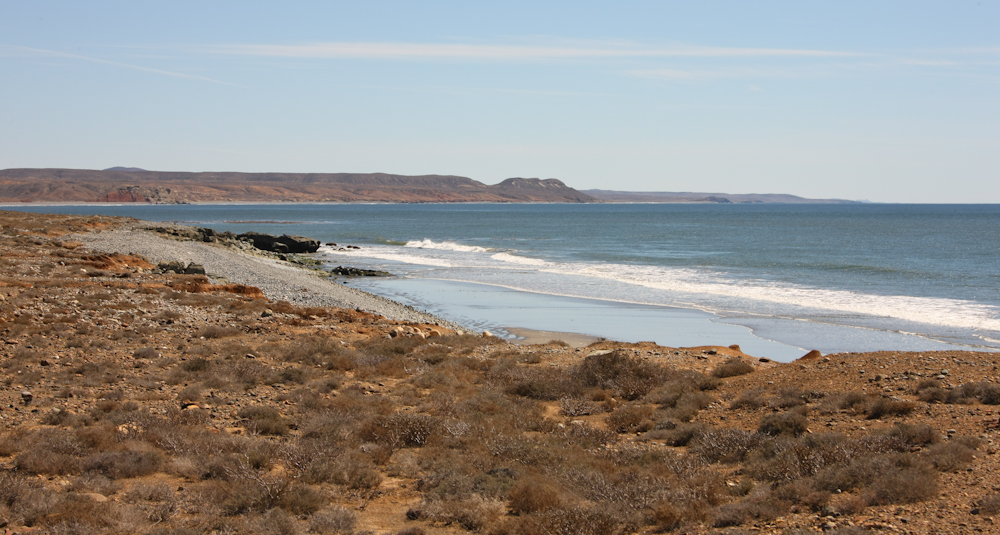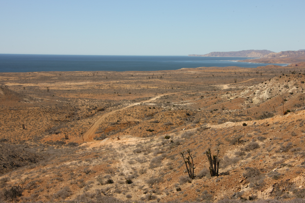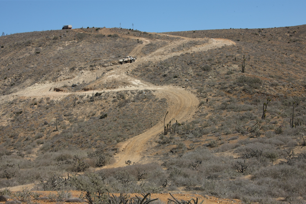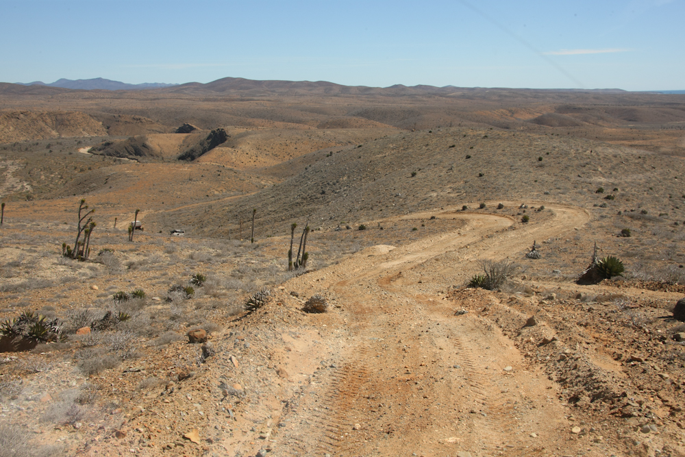 The group attempted a beach run, but was turned back by the gravel berms. Above, they return to the "main" road which is visible along the coast.