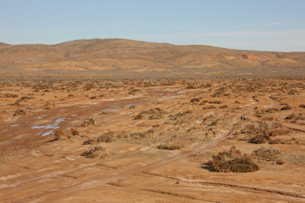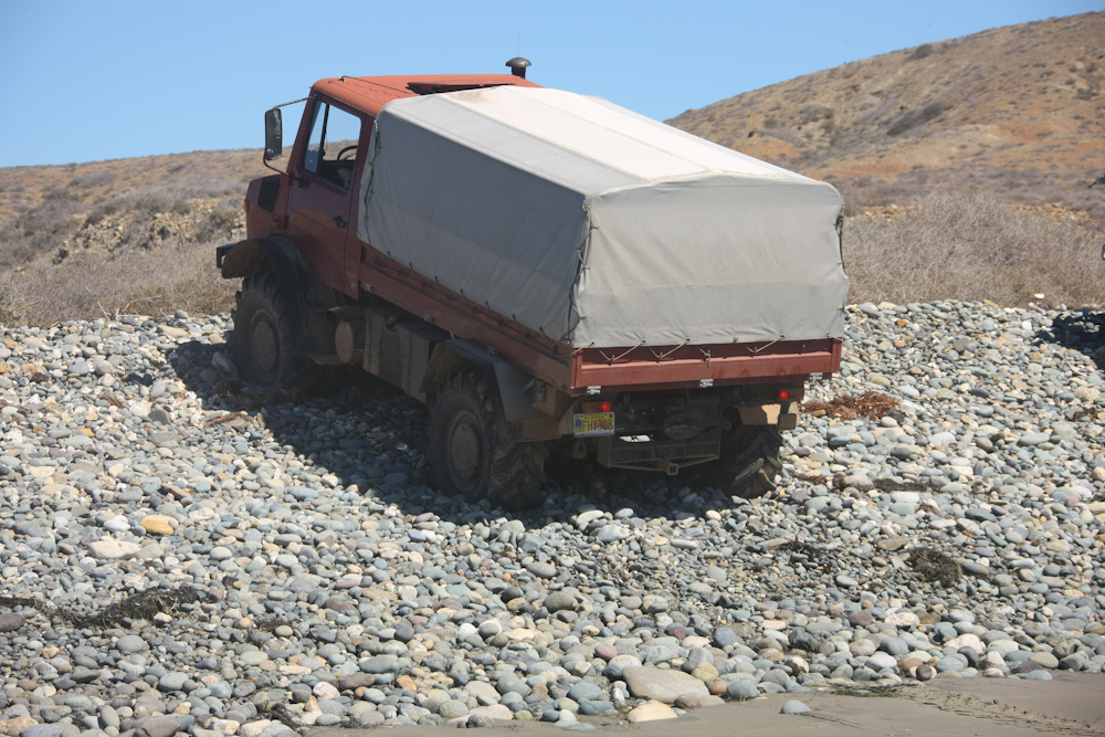 Danger ahead: these silt beds are soaked due to both rain and recent high tides. We did cross it, but not in the used tracks. We went way to the right across the brush to avoid the really wet sections. Meanwhile, the other members of the team were on the beach but had to retreat due to the gravel berms.