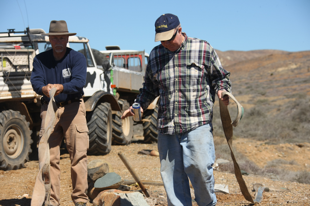 It was an "easy out" on the berm, but we strapped both Matt and Kai's trucks together to insure that they did not dig deep ruts giving me a tug. All parties agreed that if I had made one final attempt that I would have made it unassisted. And, having seen the video made by Bob, I agreed. But, sometimes discretion is the better part of valor.