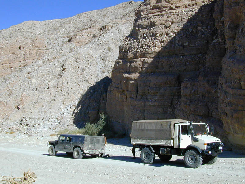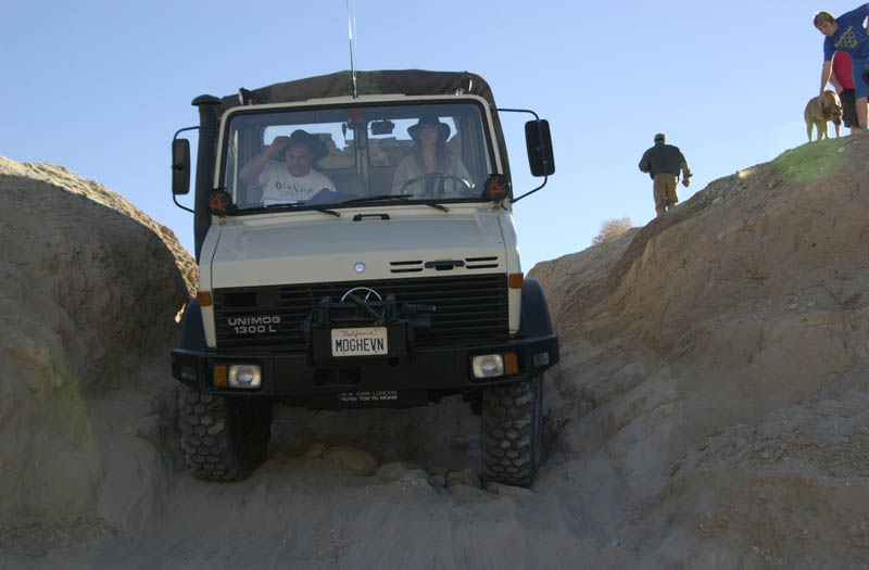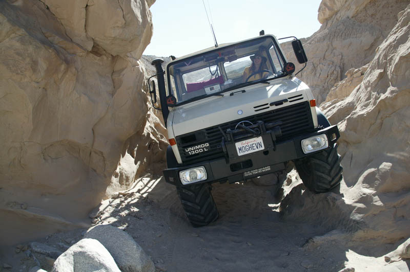 in Borrego, Kathleen pilots the 1300 through a narrow canyon.