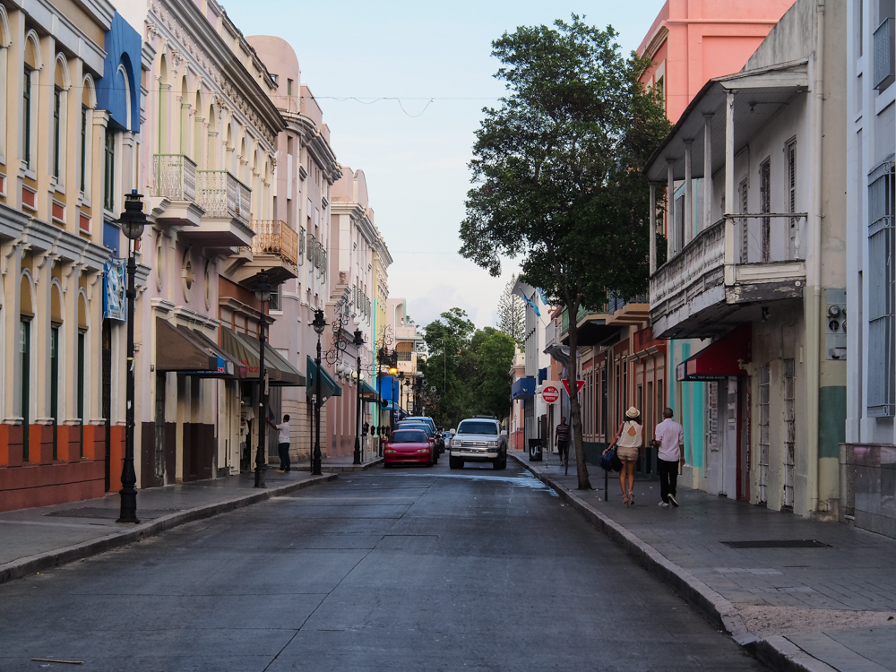 While the model's exit path may have influenced my decision to take this photo, the real purpose was to show the colonial nature of the buildings and streets in downtown Ponce.