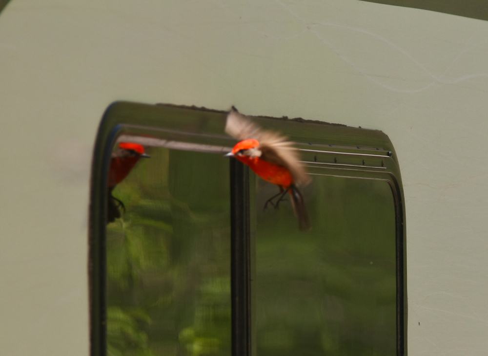 red bird beating himself to death on the window of the