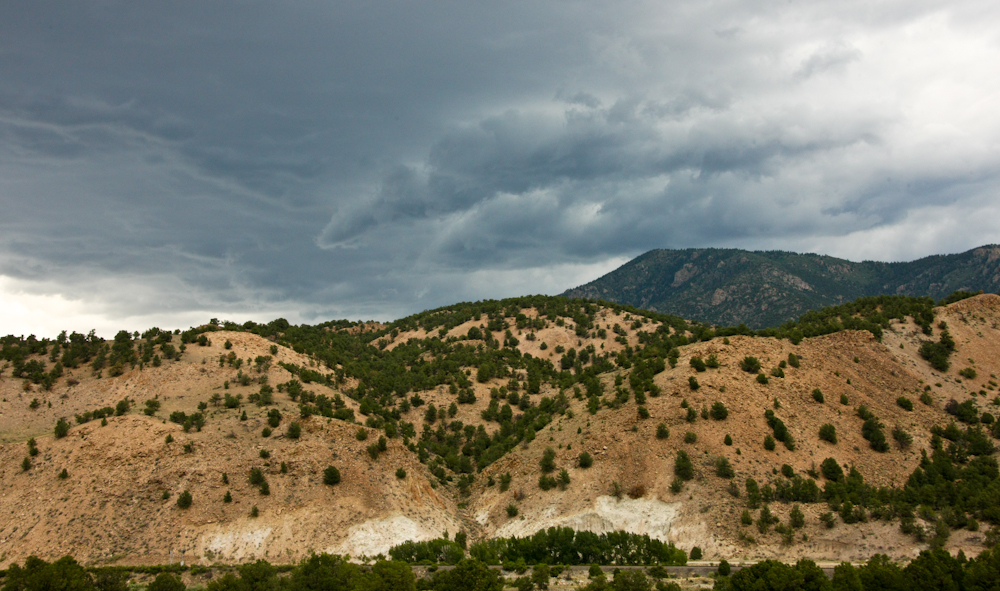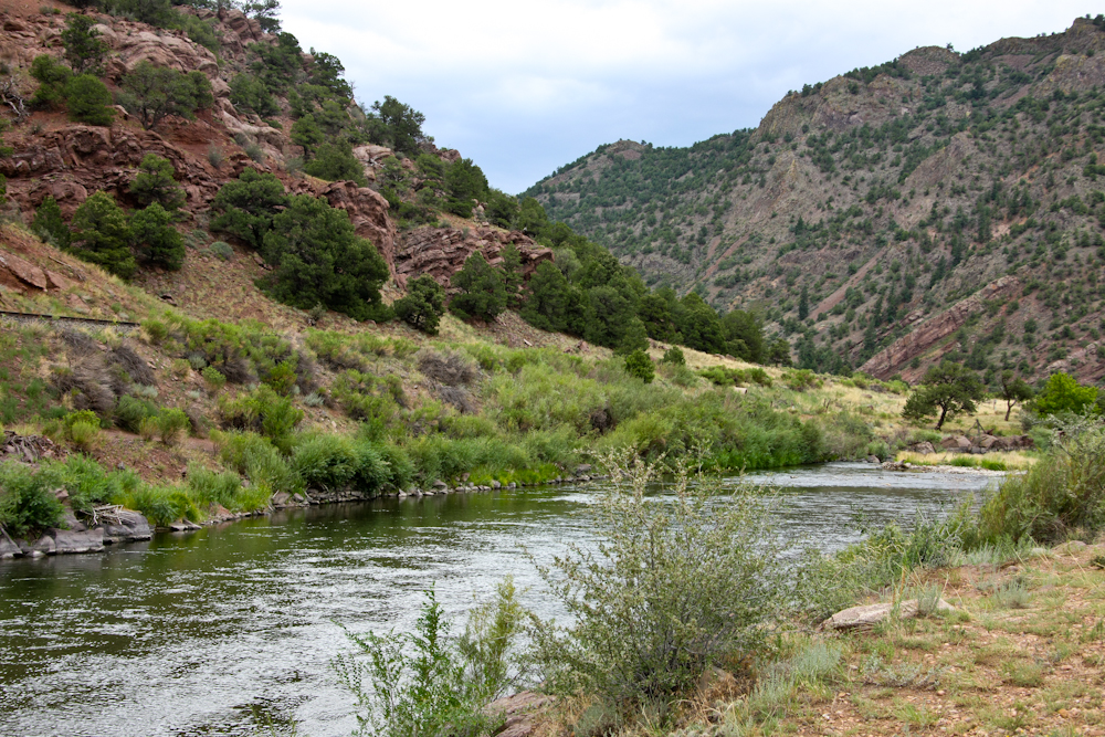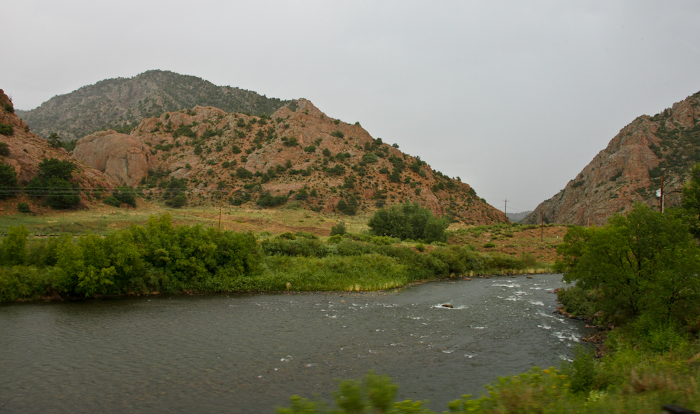 There were tons of folks on the road with campers, trailers and the like and given that it was a Friday we took the first reasonable camp that was available, in this case a Colorado state administered recreation area next to the Arkansas river. The good news was that the site was level and right next to the water. The bad news was that it was also next to the highway since there was minimal "bottom land" in the canyon. But, we were only going to be here one night and given the day, we happily accepted the site.