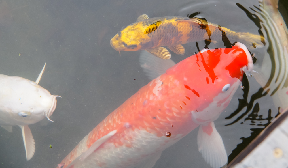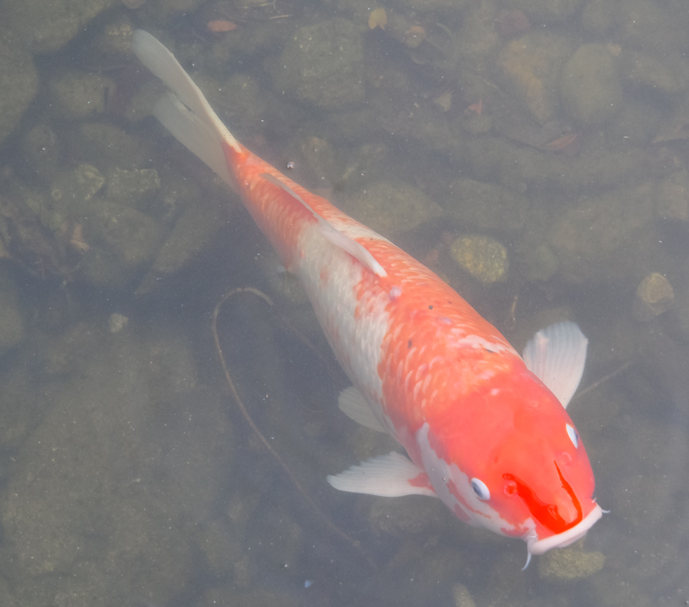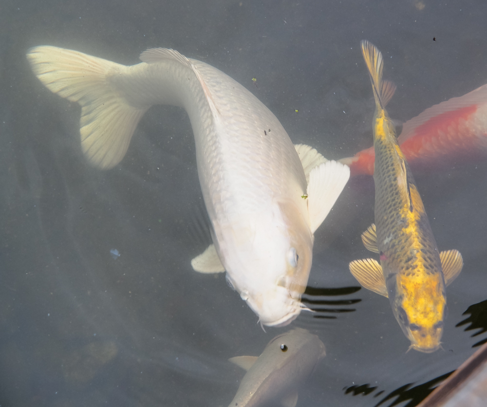 There were a whole set of koi in the pond but only a few were in our area close enough to photograph. The white koi was about a foot long and the yellow one perhaps 9 inches. Back in the day, there was a sushi bar in the building and I always wondered if the koi were secretly on the menu. Of course, that never deterred me from eating the sushi.