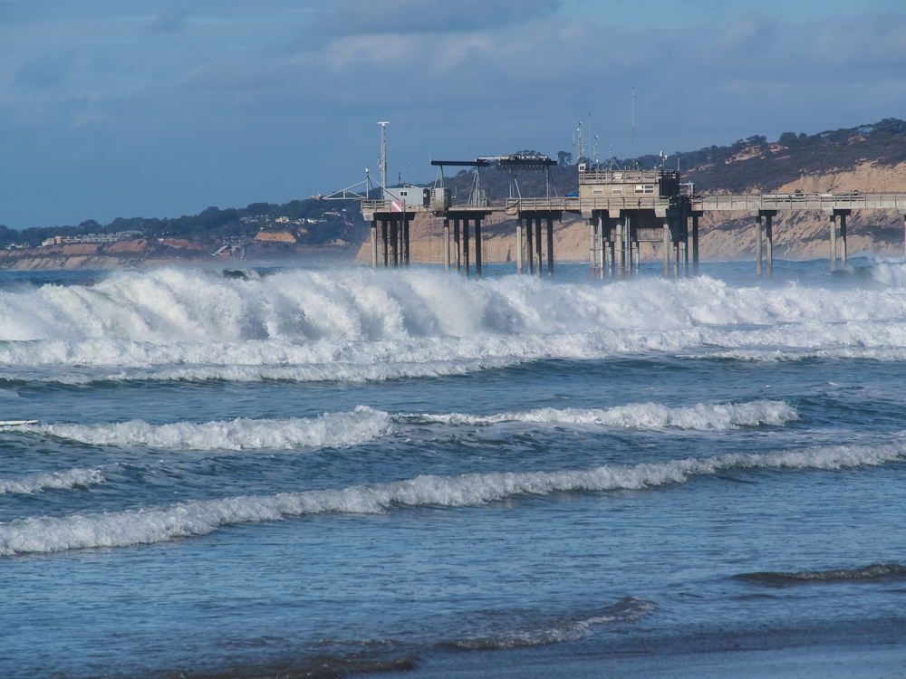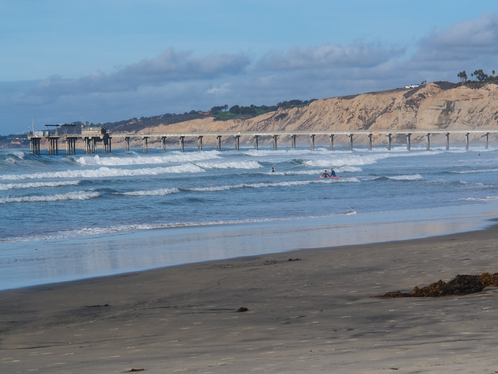 to the north are the Scripps Institute pier and the cliffs of