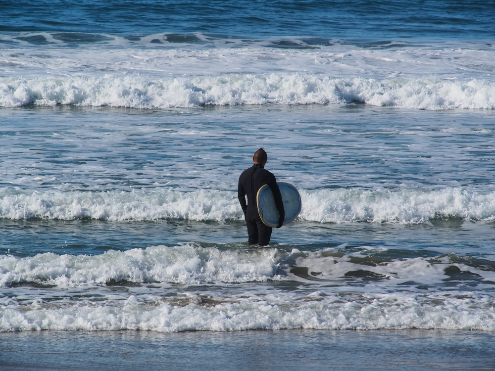fellow stand in the surf and gaze at the waves for some time
