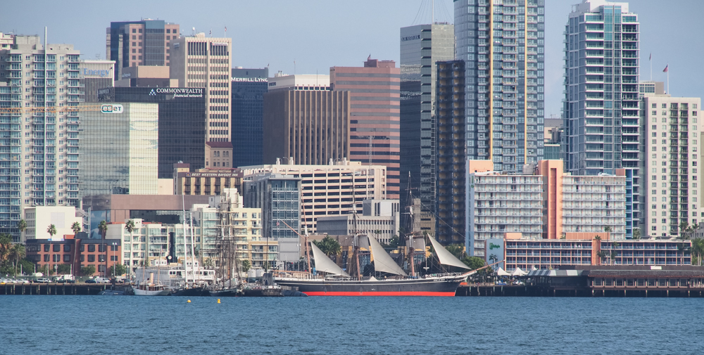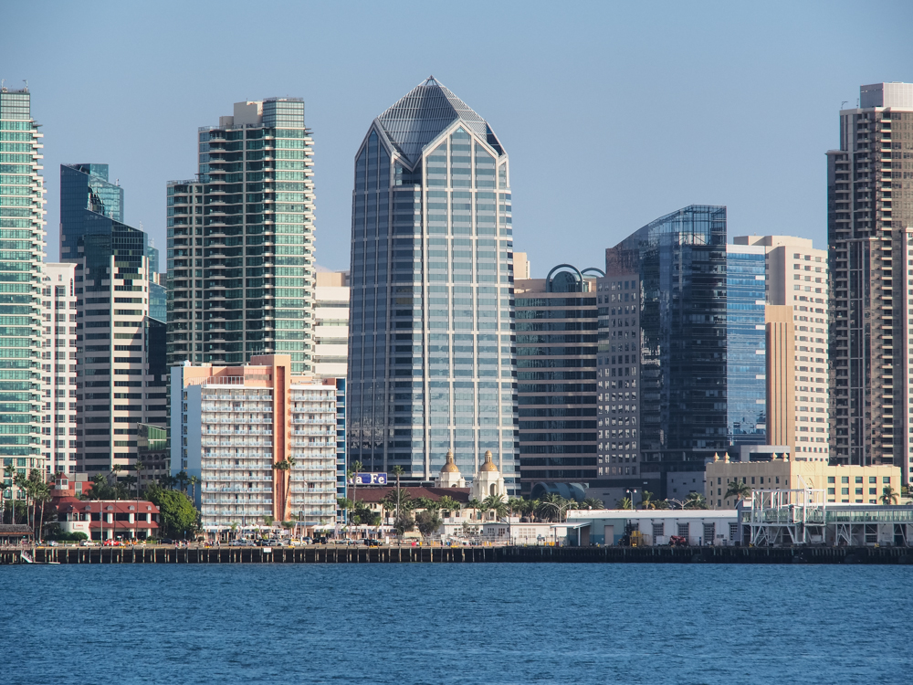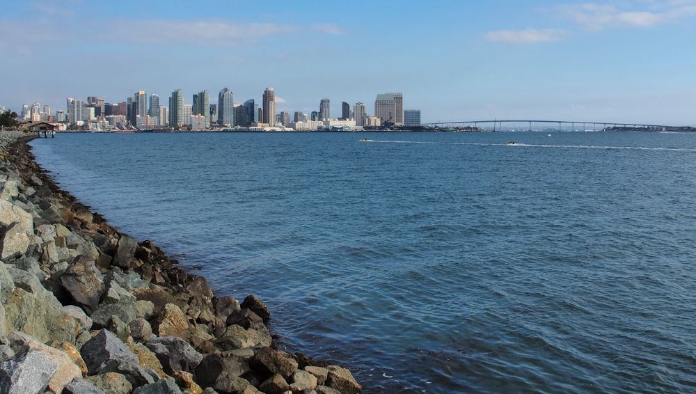 Bay-side view of the San Diego skyline and Coronado Bridge.