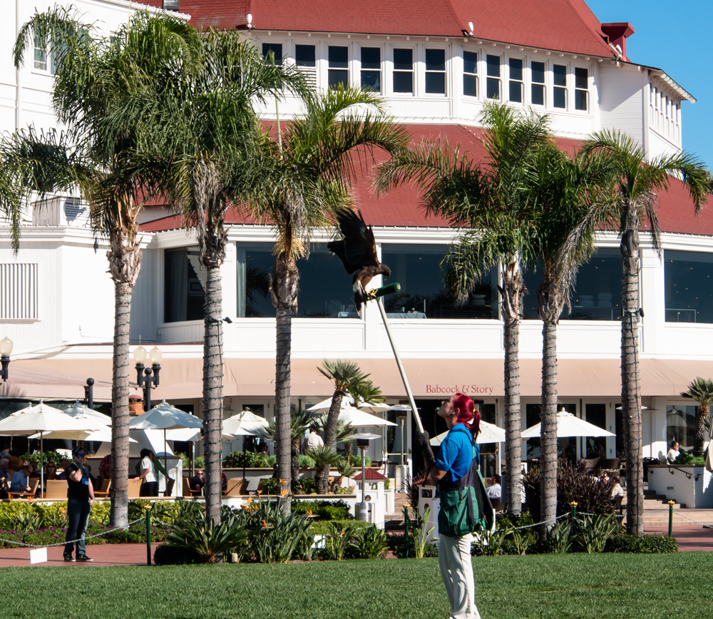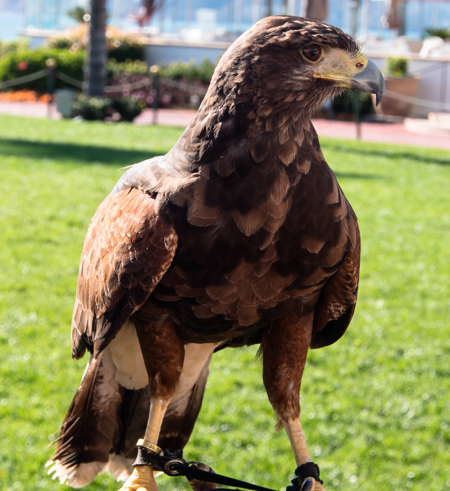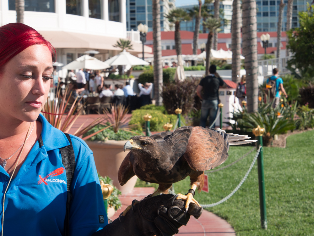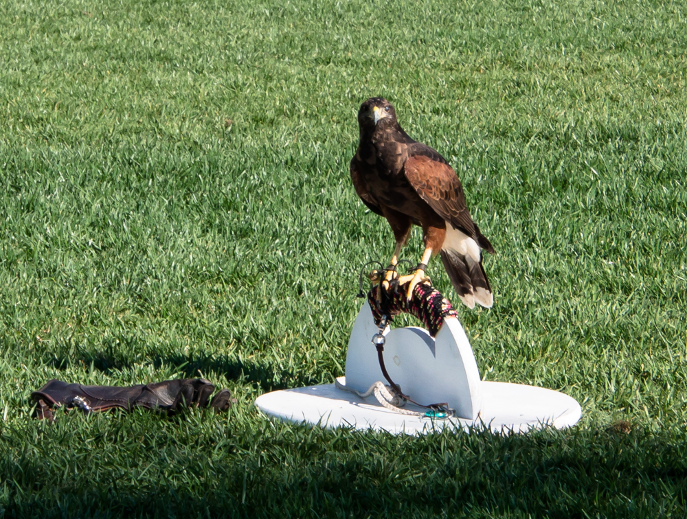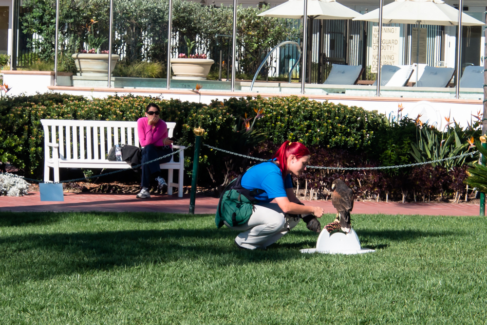 she hunts with the bird (she scares up the rabbits for the hawk)