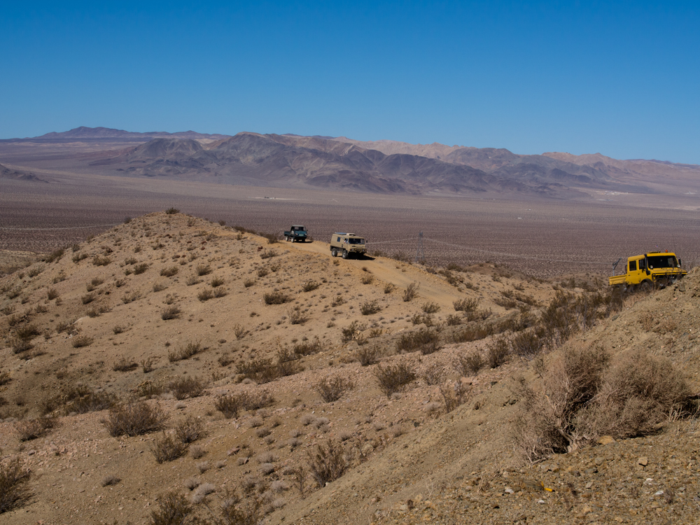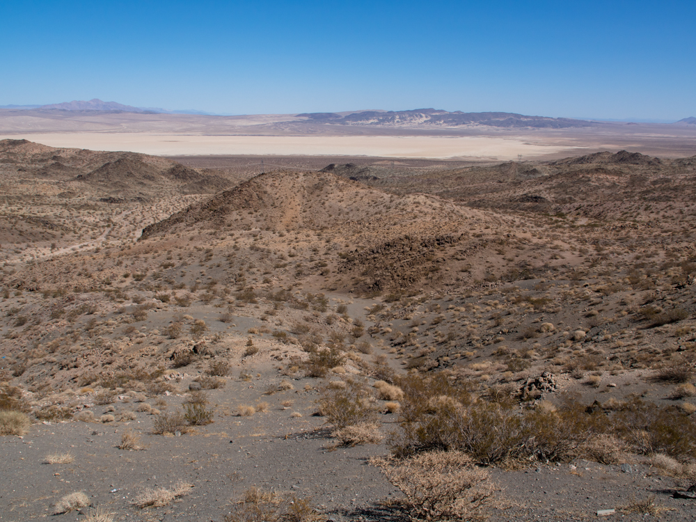 We crossed over the ridges and descended on the far side with a view of a dry lake in the distance.
