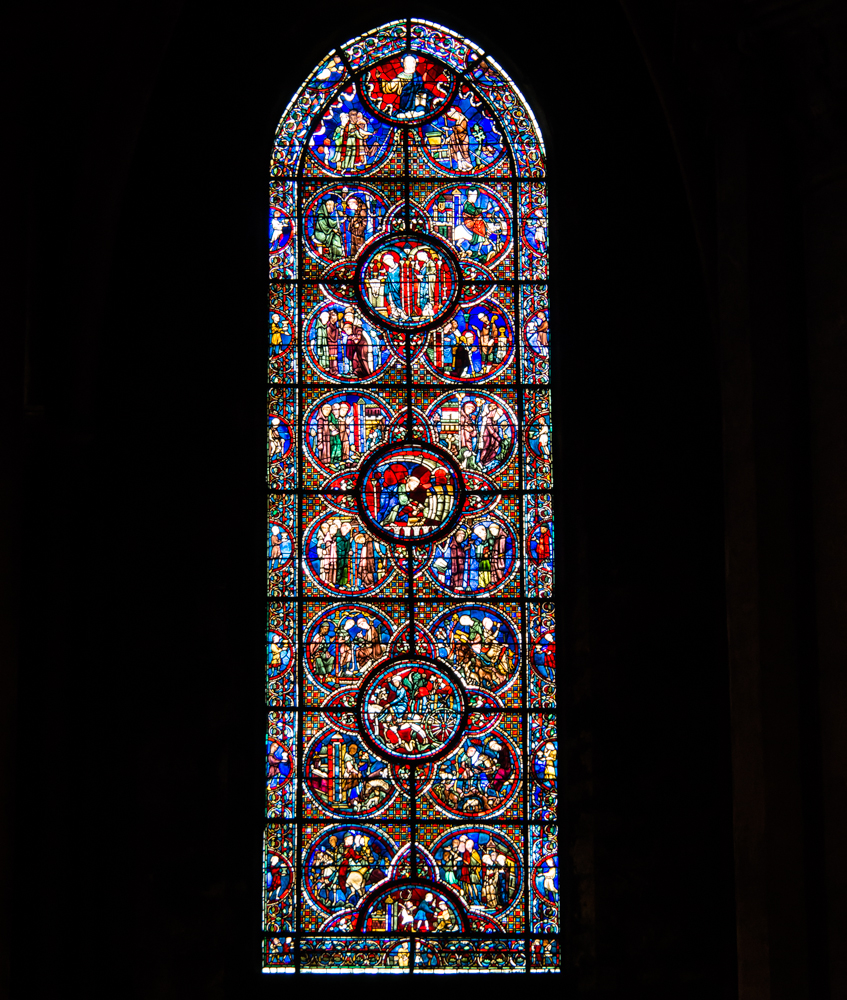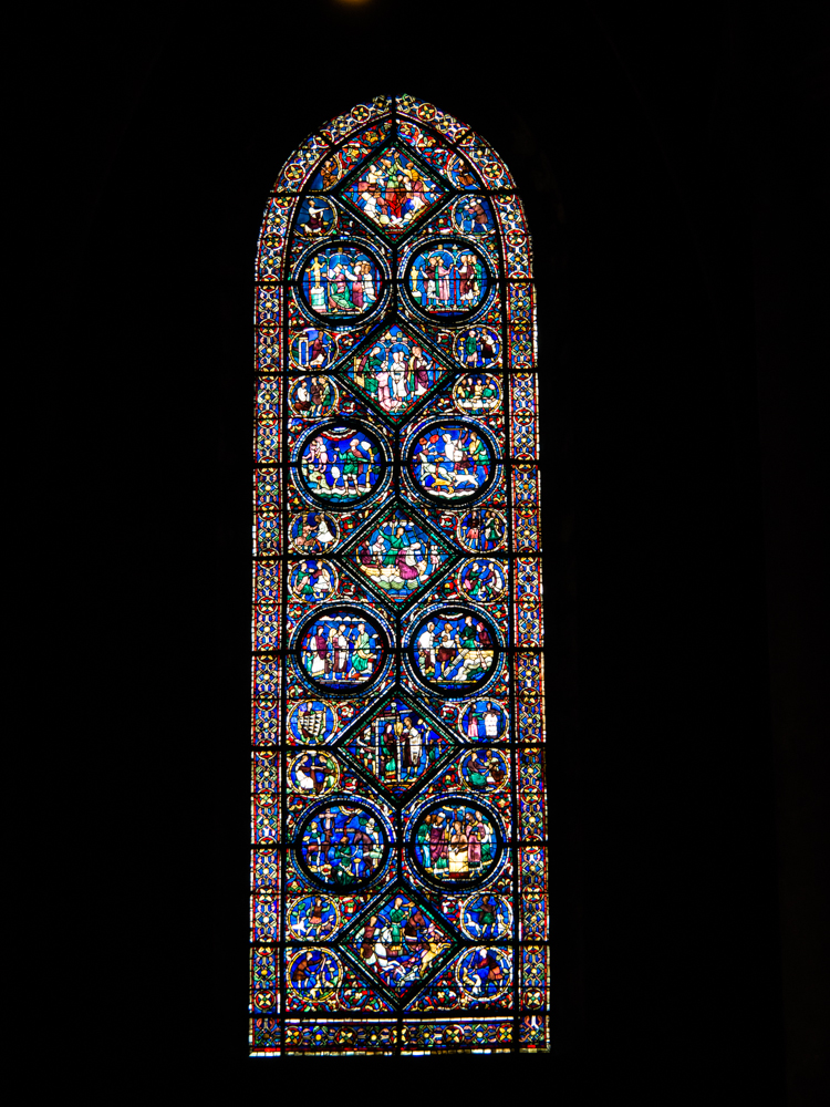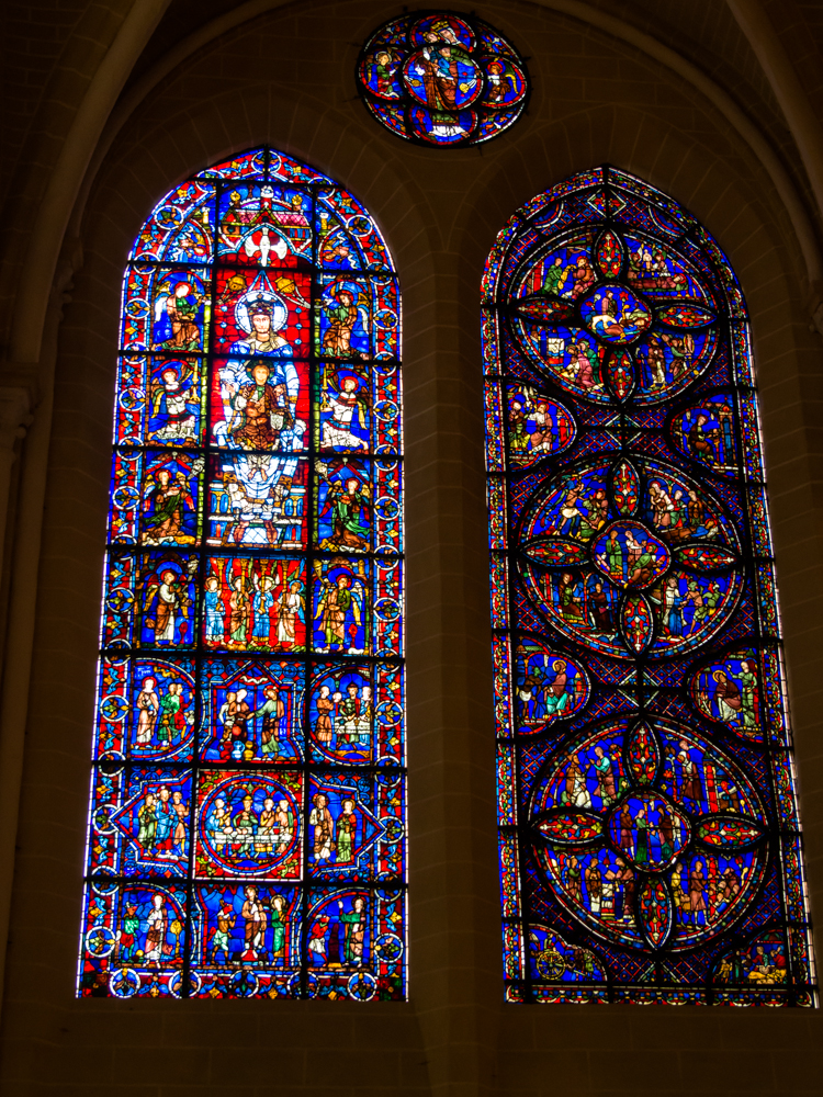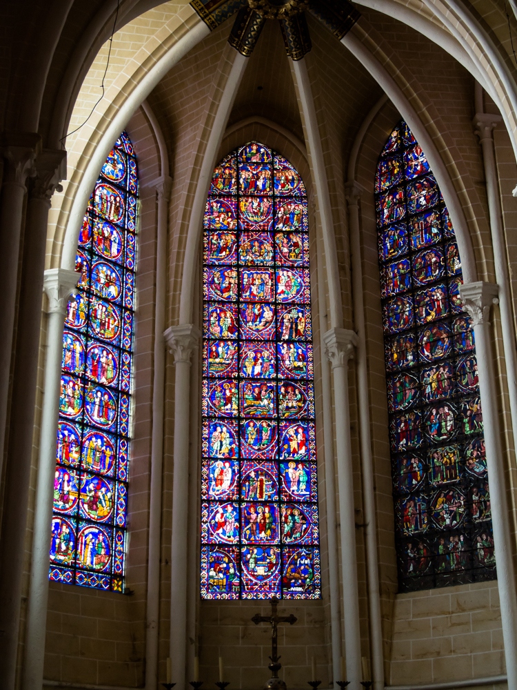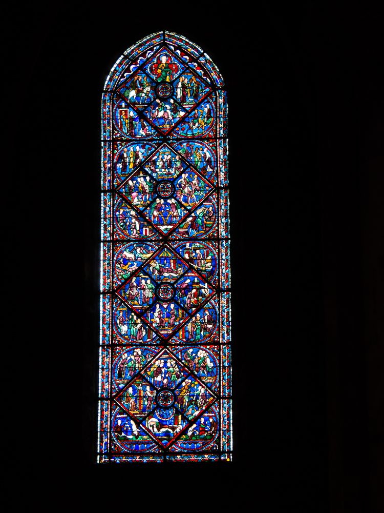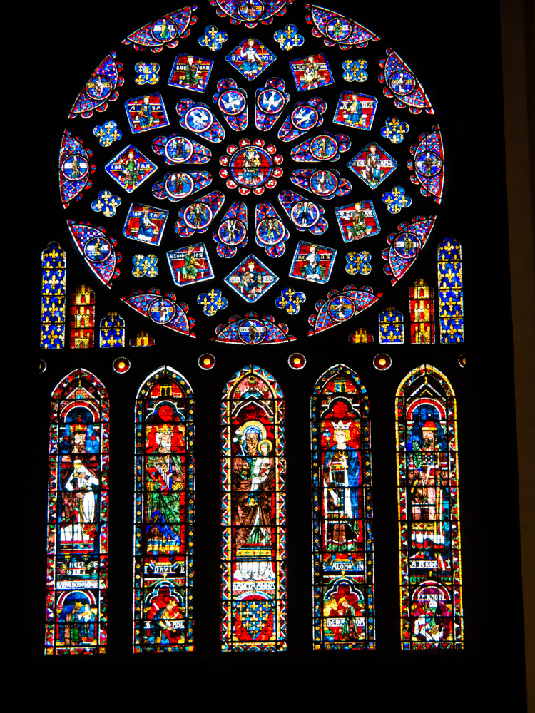 The entire structure at Chartres is very well preserved. The stained glass is exceptional, however, with most of the glass being unmodified since its installation in the early 13th century. The stained glass was intended as messaging for the masses. Since they were generally illiterate, these were iconographic. They are read left to right from bottom to top and usually depict a message from the bible typically ending with Jesus at the top or it is a depiction of local life.