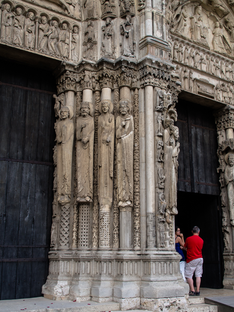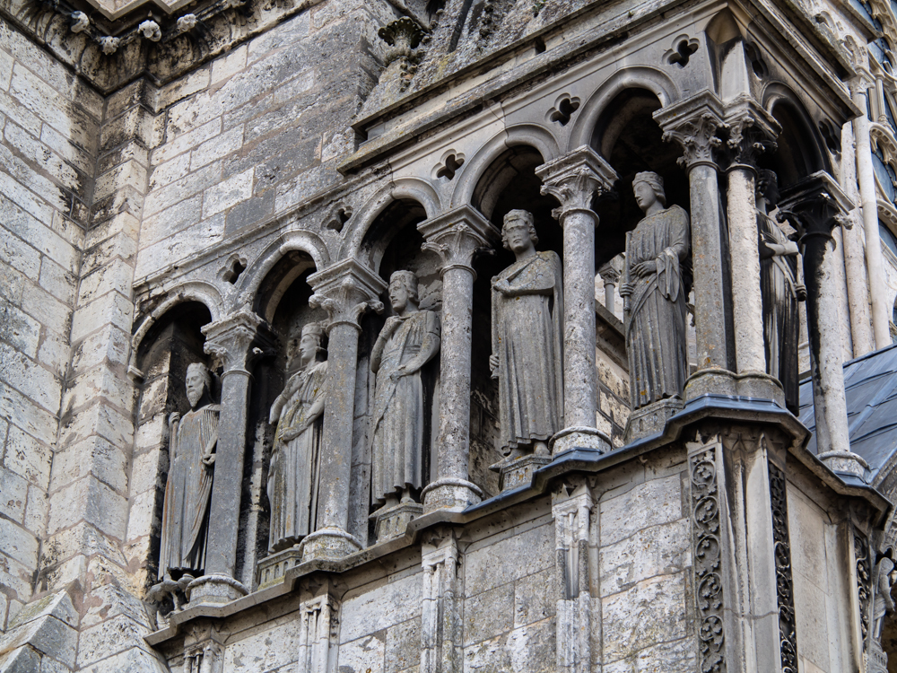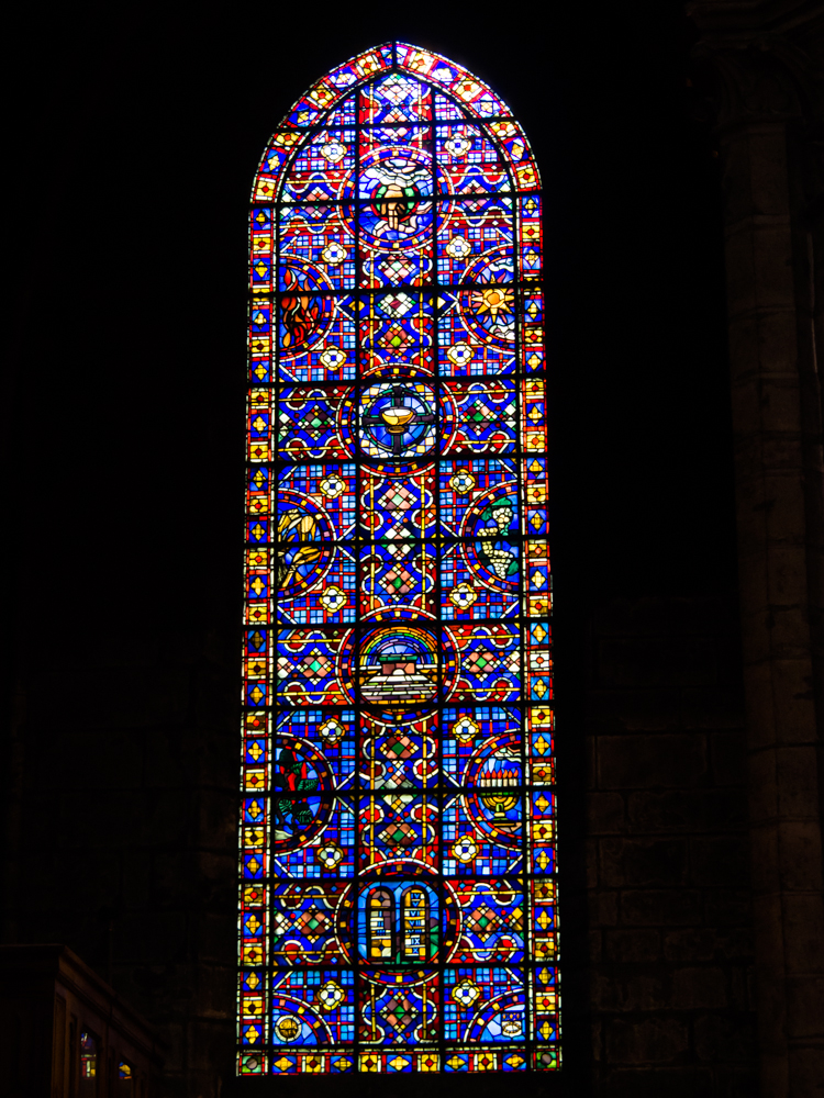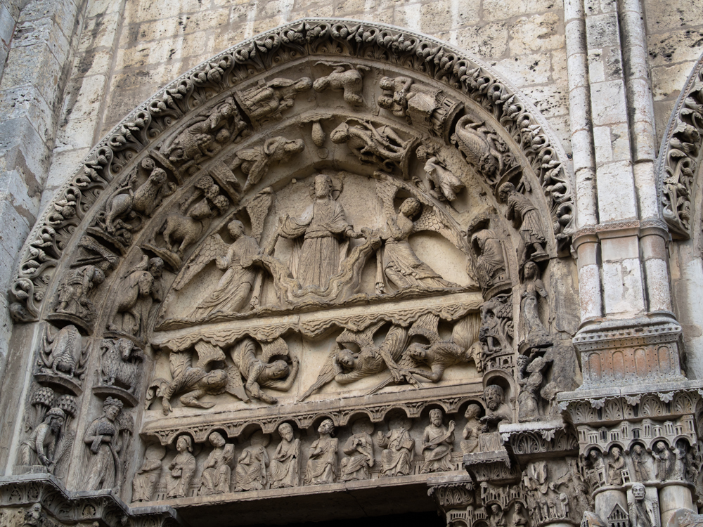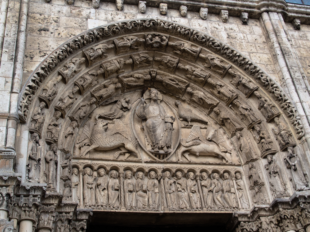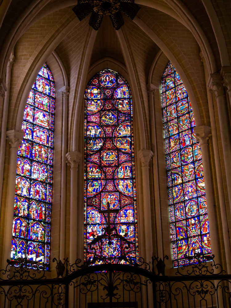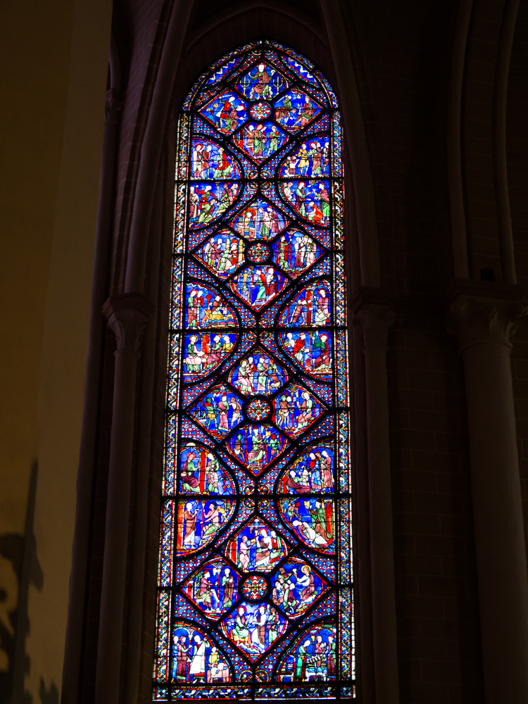 The entire structure at Chartres is very well preserved. The stained glass is exceptional, however, with most of the glass being unmodified since its installation in the early 13th century. The stained glass was intended as messaging for the masses. Since they were generally illiterate, these were iconographic. They are read left to right from bottom to top and usually depict a message from the bible typically ending with Jesus at the top or it is a depiction of local life.