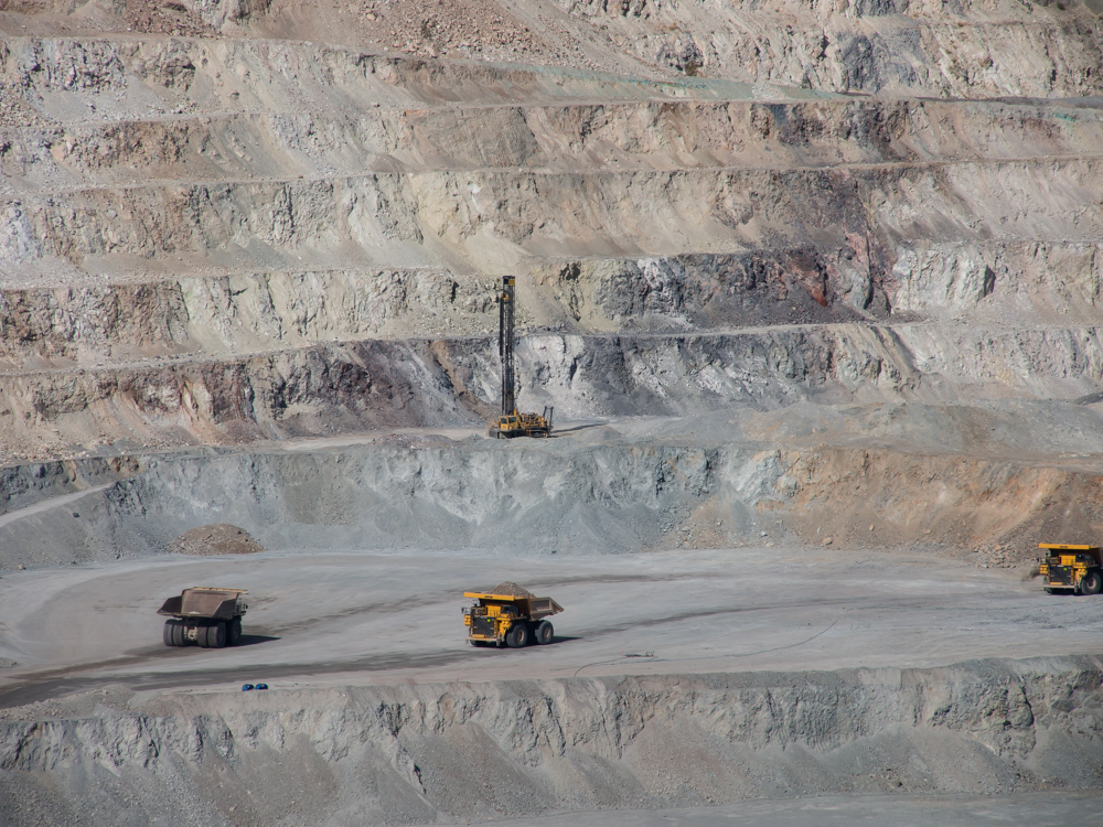 drilling rig is preparing blasting holes for slurry. Meanwhile, haul trucks are taking